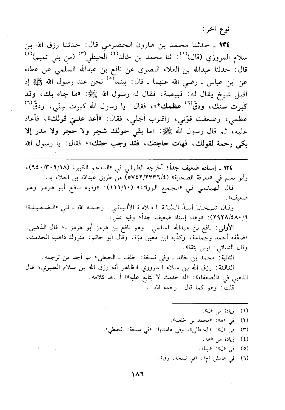 134 - حدثنا محمد بن هارون الحضرمي قال: حدثنا رزق الله بن سلام المروزي (قال) (¬1): ثنا محمد بن خالد (¬2) الحبطي (¬3) (من بني تميم) (¬4) قال: حدثنا عبد الله بن العلاء البصري عن نافع بن عبد الله السلمي عن عطاء عن ابن عباس - رضي الله عنهما - قال: بينما (¬5) نحن عند رسول الله - صلى الله عليه وسلم - إذ أقبل شيخ يقال له: قبيصة، فقال له رسول الله - صلى الله عليه وسلم -: "ما جاء بك، وقد كبرت سنك، ودقّ (¬6) عظمك؟ "، فقال: يا رسول الله أكبرت سِنّي، ودقَّ (6) عظمي، وضعفت قوّتي، واقترب أجلي، فقال: "أعد عليّ قولك"، فأعاد عليه، ثم قال رسول الله - صلى الله عليه وسلم -: "ما بقي حولك شجر ولا حجر ولا مدر إلا بكى رحمة لقولك، فهات حاجتك، فقد وجب حقك"؛ فقال: يا رسول الله