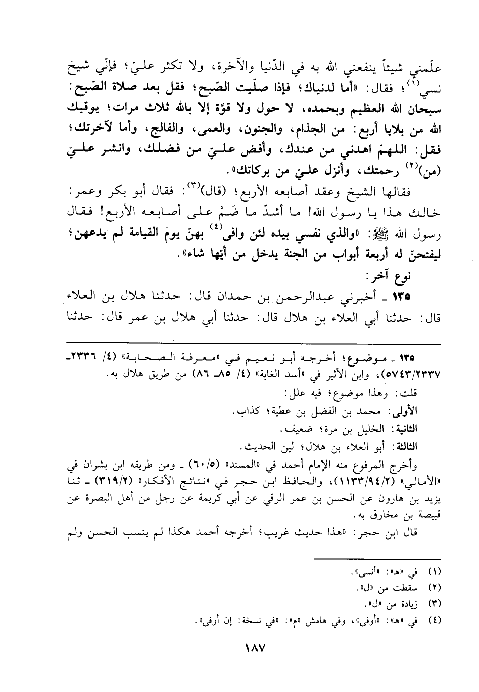 135 - أخبرني عبد الرحمن بن حمدان قال: حدثنا هلال بن العلاء قال: حدثنا أبي العلاء بن هلال قال: حدثنا أبي هلال بن عمر قال: حدثنا