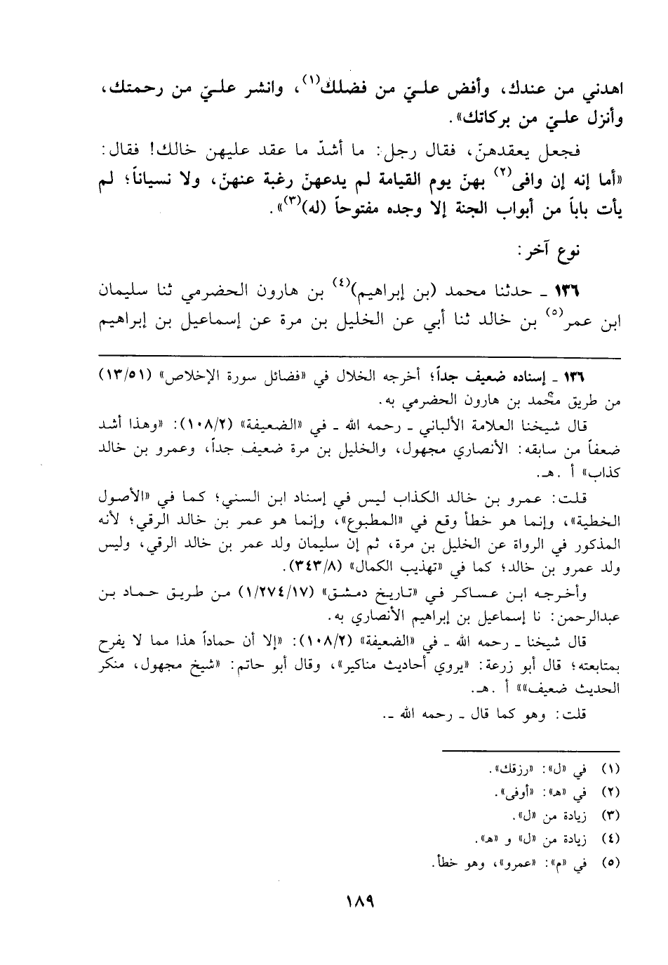 قلت: عمرو بن خالد الكذاب ليس في إسناد ابن السني؛ كما في "الأصول الخطية"، وإنما هو خطأ وقع في "المطبوع"، وإنما هو عمر بن خالد الرقي؛ لأنه المذكور في الرواة عن الخليل بن مرة، ثم إن سليمان ولد عمر بن خالد الرقي، وليس ولد عمرو بن خالد؛ كما في "تهذيب الكمال" (8/ 343).