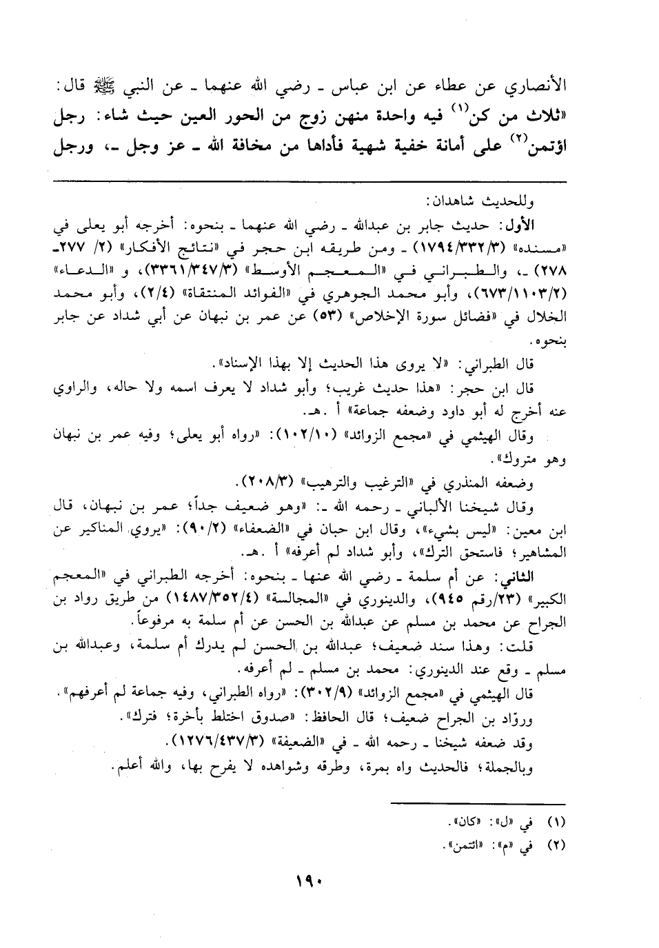 الأنصاري عن عطاء عن ابن عباس - رضي الله عنهما - عن النّبيّ - صلى الله عليه وسلم - قال: "ثلاث من كن (¬1) فيه واحدة منهن زوج من الحور العين حيث شاء: رجل اؤتمن (¬2) على أمانة خفية شهية فأداها من مخافة الله - عَزَّ وَجَلَّ -، ورجل