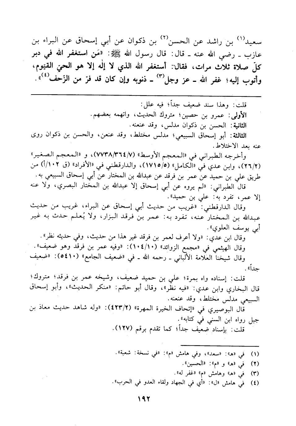 سعيد (¬1) بن راشد عن الحسن (¬2) بن ذكران عن أبي إسحاق عن البراء بن عازب - رضي الله عنه - قال: قال رسول الله - صلى الله عليه وسلم -: "مَن استعْفر الله في دبر كلّ صلاة ثلاث مرات، فقال: أستغفر الله الذي لا إله إلا هو الحيّ القيّوم، وأتوب إليه؛ غفر الله - عَزَّ وَجَلَّ (¬3) - ذنوبه وإن كان قد فرّ من الزحف (¬4) ".