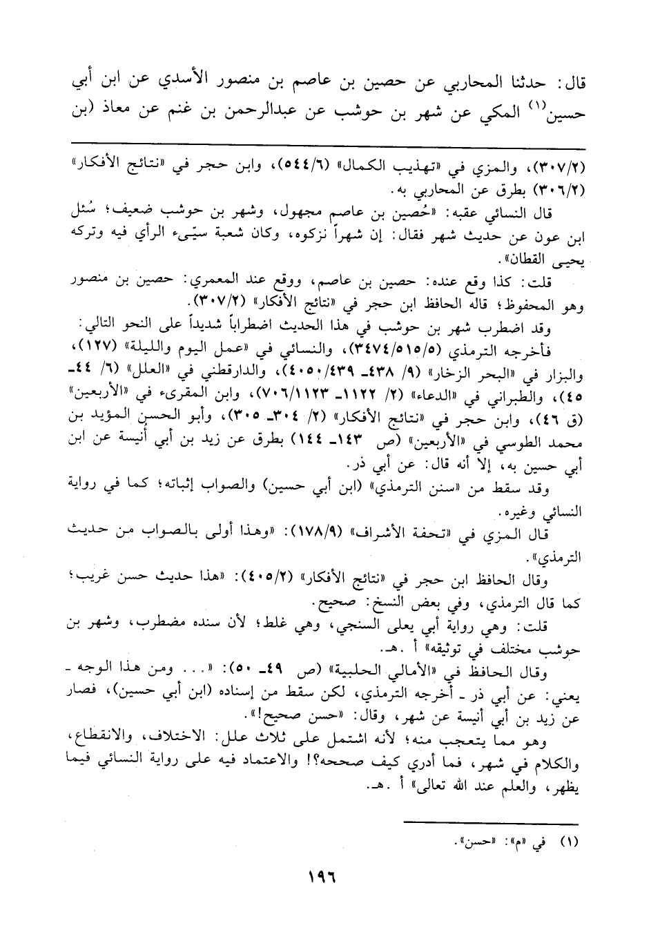 قال النسائي عقبه: "حُصين بن عاصم مجهول، وشهر بن حوشب ضعيف؛ سُئل ابن عون عن حديث شهر فقال: إن شهرًا نزكوه، وكان شعبة سيّىء الرأي فيه وتركه يحيى القطان".