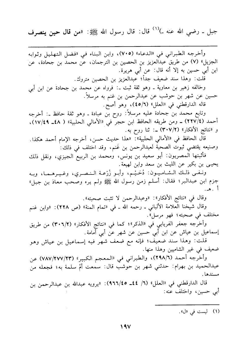 وخالفه زهير بن معاوية -وهو ثقة ثبت-: فرواه عن محمد بن جحادة عن ابن أبي حسين عن شهر بن حوشب عن عبد الرحمن بن غنم به مرسلًا.