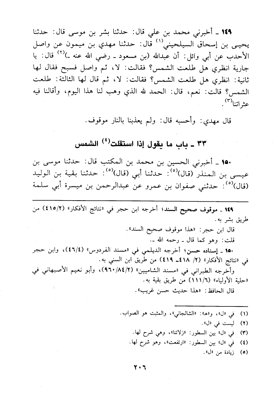 149 - أخبرني محمد بن علي قال: حدثنا بشر بن موسى قال: حدثنا يحيى بن إسحاق السيلحيني (¬1) قال: حدثنا مهدي بن ميمون عن واصل الأحدب عن أبي وائل: أن عبد الله (بن مسعود - رضي الله عنه -) (¬2) قال: يا جارية انظري هل طلعت الشمس؟ فقالت: لا، ثم واصل فسبح فقال لها ثانية: انظري هل طلعت الشمس؟ فقالت: لا، ثم قال لها الثالثة: طلعت الشمس؟ قالت: نعم، قال: الحمد لله الذي وهب لنا هذا اليوم، وأقالنا فيه عثراتنا (¬3).