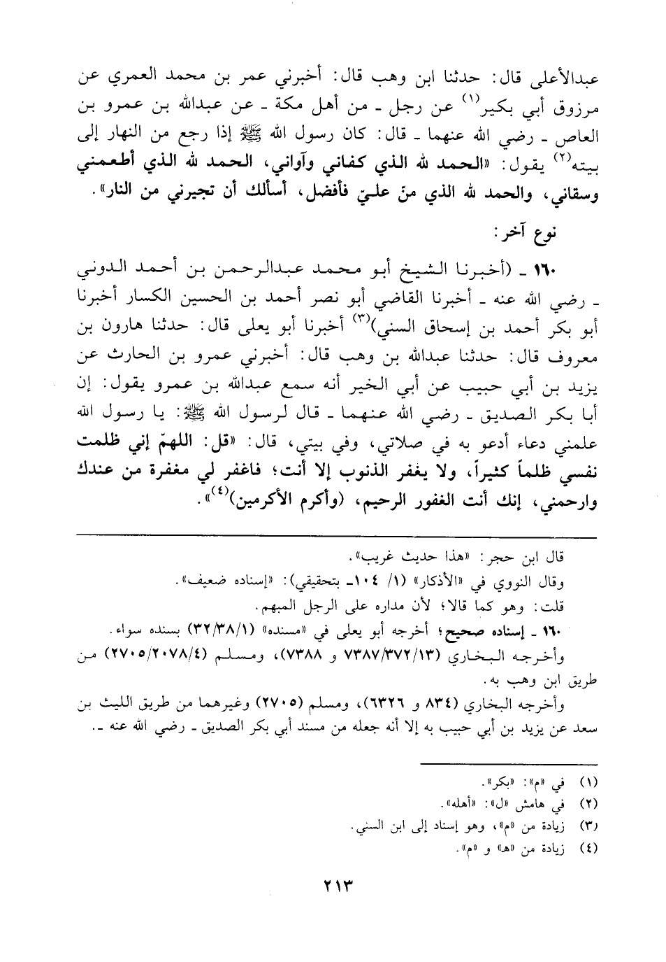 160 - (أخبرنا الشيخ أبو محمد عبد الرحمن بن أحمد الدوني - رضي الله عنه - أخبرنا القاضي أبو نصر أحمد بن الحسين الكسار أخبرنا أبو بكر أحمد بن إسحاق السني) (¬3) أخبرنا أبو يعلى قال: حدثنا هارون بن معروف قال: حدثنا عبد الله بن وهب قال: أخبرني عمرو بن الحارث عن يزيد بن أبي حبيب عن أبي الخير أنه سمع عبد الله بن عمرو يقول: إن أبا بكر الصديق - رضي الله عنهما - قال لرسول الله - صلى الله عليه وسلم -: يا رسول الله علمني دعاء أدعو به في صلاتي, وفي بيتي، قال: "قل: اللهمّ إني ظلمت نفسي ظلمًا كثيرًا، ولا يغفر الذنوب إلا أنت؛ فاغفر لي مغفرة من عندك وارحمني، إنك أنت الغفور الرحيم، (وأكرم الأكرمين) (¬4) ".