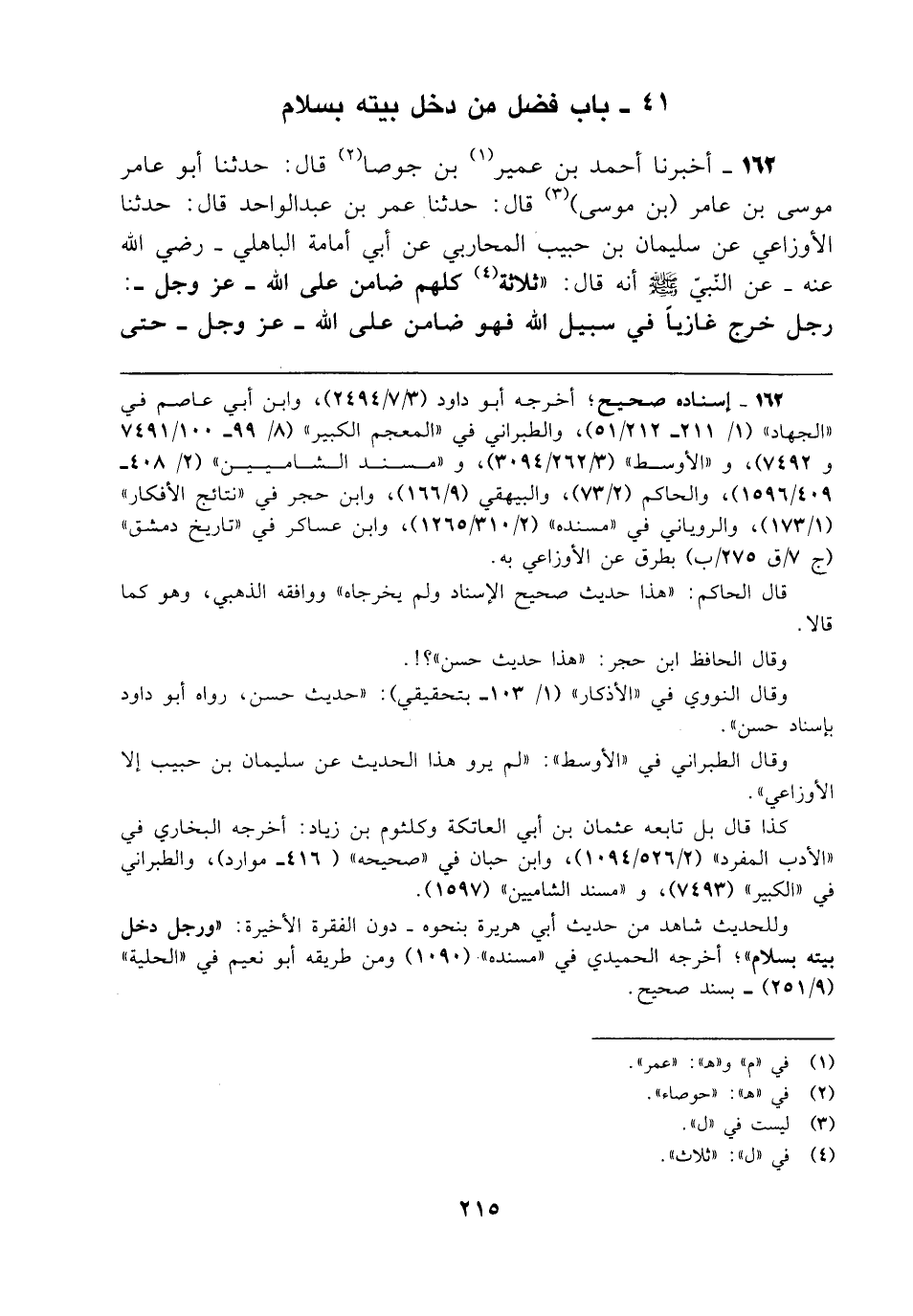 162 - أخبرنا أحمد بن عمير (¬1) بن جوصا (¬2) قال: حدثنا أبو عامر موسى بن عامر (بن موسى) (¬3) قال: حدثنا عمر بن عبد الواحد قال: حدثنا الأوزاعي عن سليمان بن حبيب المحاربي عن أبي أمامة الباهلي - رضي الله عنه - عن النّبيّ - صلى الله عليه وسلم - أنه قال: "ثلاثة (¬4) كلهم ضامن على الله - عَزَّ وَجَلَّ -: رجل خرج غازيًا في سبيل الله فهو ضامن على الله - عَزَّ وَجَلَّ - حتى