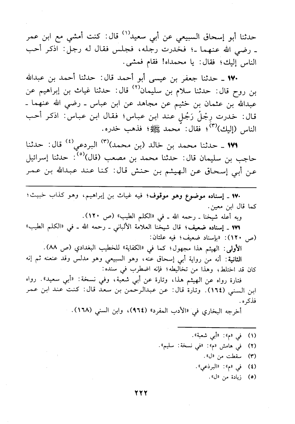 171 - حدثنا محمد بن خالد (بن محمد) (3) البردعي (¬4) قال: حدثنا حاجب بن سليمان قال: حدثنا محمد بن مصعب (قال) (¬5): حدثنا إسرائيل عن أبي إسحاق عن الهيثم بن حنش قال: كنا عند عبد الله بن عمر