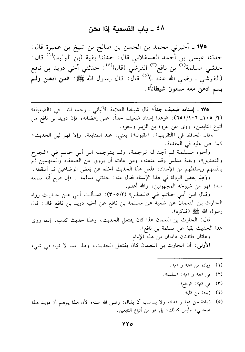 175 - أخبرني محمد بن الحسن بن صالح بن شيخ بن عميرة قال: حدثنا عيسى بن أحمد العسقلاني قال: حدثنا بقية (بن الوليد) (¬1) قال: حدثني مسلمة (¬2) بن نافع (¬3) القرشي (قال) (¬4): حدثني أخي دويد بن نافع (القرشي - رضي الله عنه -) (¬5) قال: قال رسول الله - صلى الله عليه وسلم -: "من ادهن ولم يسم ادهن معه سبعون شيطانًا".