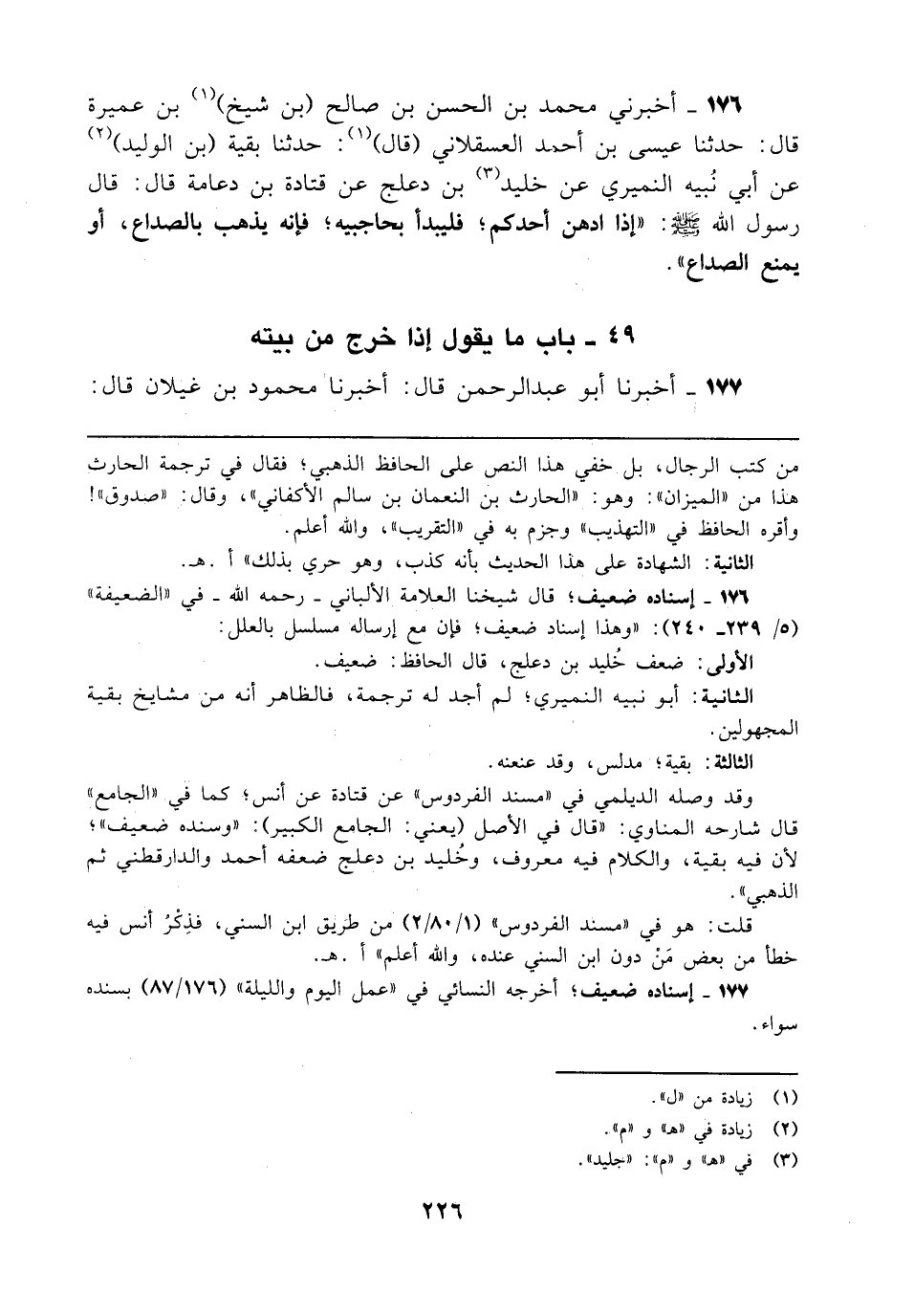 176 - إسناده ضعيفة قال شيخنا العلامة الألباني - رحمه الله - في "الضعيفة" (5/ 239 - 240): "وهذا إسناد ضعيف؛ فإن مع إرساله مسلسل بالعلل: الأولى: ضعف خُليد بن دعلج، قال الحافظ: ضعيف.