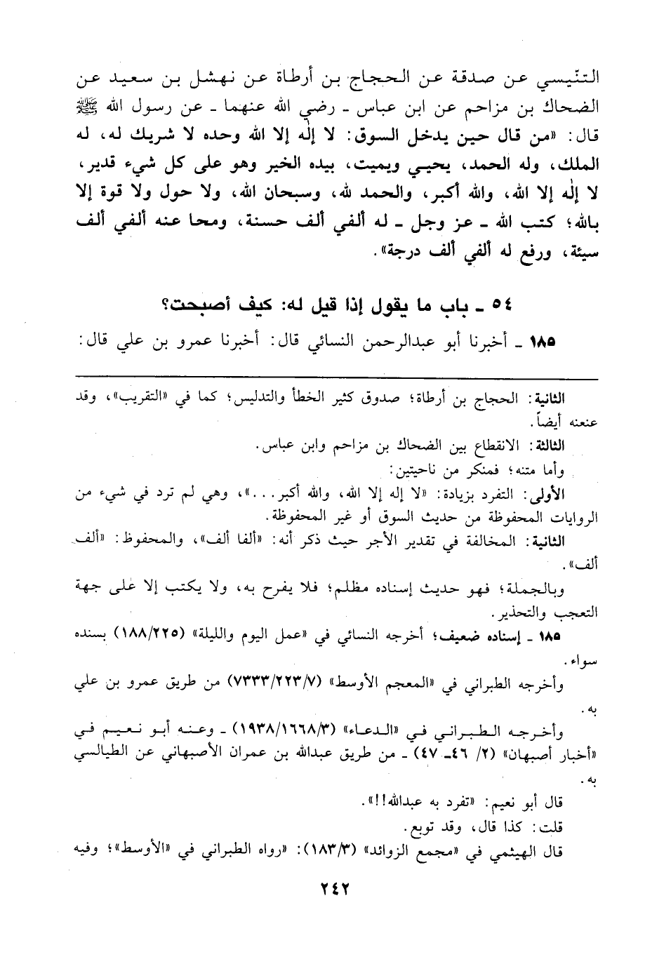 التنّيسي عن صدقة عن الحجاج بن أرطأة عن نهشل بن سعيد عن الضحاك بن مزاحم عن ابن عباس - رضي الله عنهما - عن رسول الله - صلى الله عليه وسلم - قال: "من قال حين يدخل السوق: لا إله إلا الله وحده لا شريك له، له الملك، وله الحمد، يحيي ويميت، بيده الخير وهو على كل شيء قدير، لا إله إلا الله، والله أكبر، والحمد لله، وسبحان الله، ولا حول ولا قوة إلا بالله؛ كتب الله - عَزَّ وَجَلَّ - له ألفي ألف حسنة، ومحا عنه ألفي ألف سيئة، ورفع له ألفي ألف درجة".