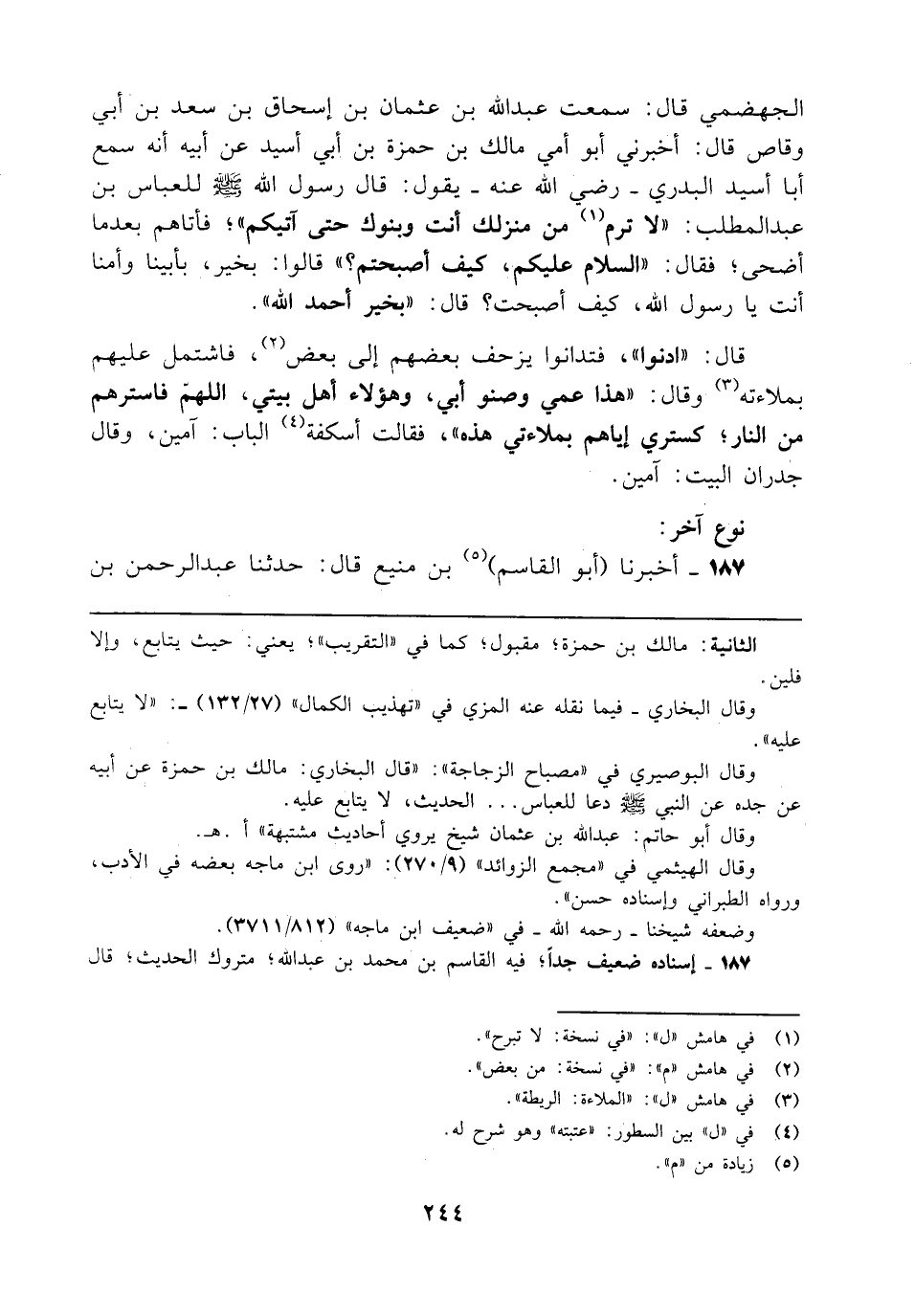 الجهضمي قال: سمعت عبد الله بن عثمان بن إسحاق بن سعد بن أبي وقاص قال: أخبرني أبو أمي مالك بن حمزة بن أبي أسيد عن أبيه أنه سمع أبا أسيد البدري - رضي الله عنه - يقول: قال رسول الله - صلى الله عليه وسلم - للعباس بن عبد المطلب: "لا ترم (¬1) من منزلك أنت وبنوك حتى آتيكم"؛ فأتاهم بعد ما أضحى؛ فقال: "السلام عليكم، كيف أصبحتم؟ " قالوا: بخير، بأبينا وأمنا أنت يا رسول الله، كيف أصبحت؟ قال: "بخير أحمد الله".