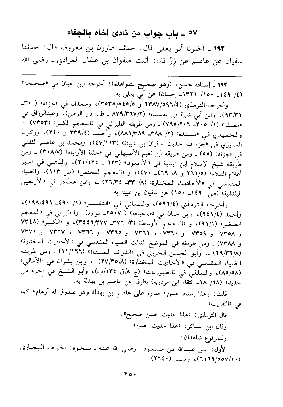 193 - أخبرنا أبو يعلى قال: حدثنا هارون بن معروف قال: حدثنا سفيان عن عاصم عن زِرٍّ قال: أتيت صفوان بن عسّال المرادي - رضي الله