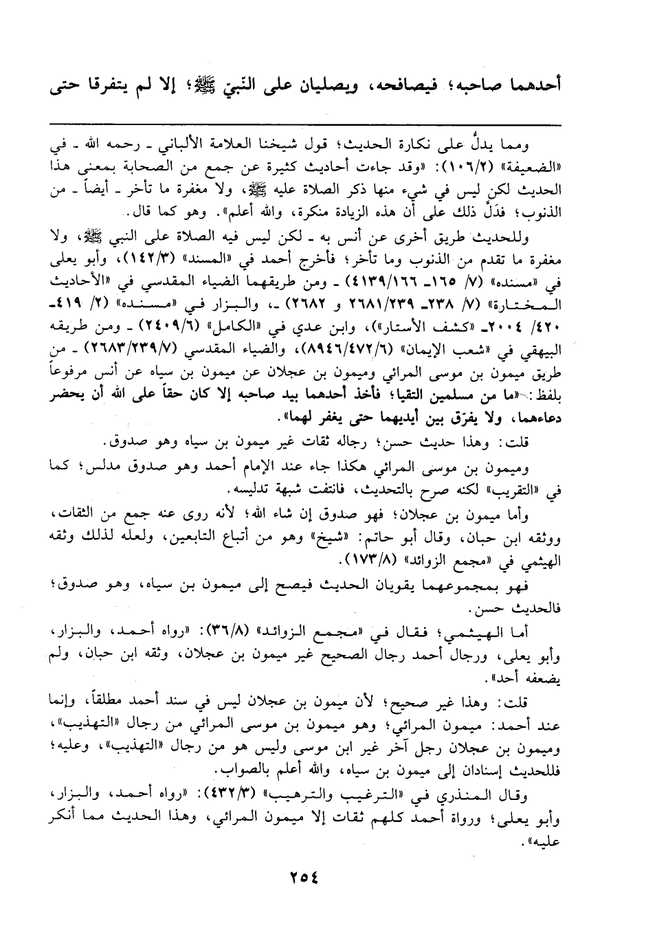 وللحديث طريق أخرى عن أنس به - لكن ليس فيه الصلاة على النبي - صلى الله عليه وسلم -، ولا مغفرة ما تقدم من الذنوب وما تأخر؛ فأخرج أحمد في "المسند" (3/ 142)، وأبو يعلى في "مسنده" (7/ 165 - 166/ 4139) -ومن طريقهما الضياء المقدسي في "الأحاديث المختارة " (7/ 238 - 239/ 2681 و 2682) -، والبزار في "مسنده" (2/ 419 - 420/ 204 - "كشف الأستار")، وابن عدي في "الكامل" (6/ 2409) -ومن طريقه البيهقي في "شعب الإيمان" (6/ 472/ 8946)، والضياء المقدسي (7/ 239/ 2683) - من طريق ميمون بن موسى المرائي وميمون بن عجلان عن ميمون بن سياه عن أنس مرفوعًا بلفظ: "ما من مسلمين التقيا؛ فأخذ أحدهما بيد صاحبه إلا كان حقًا على الله أن يحضر دعاءهما، ولا يفرّق بين أيديهما حتى يغفر لهما".