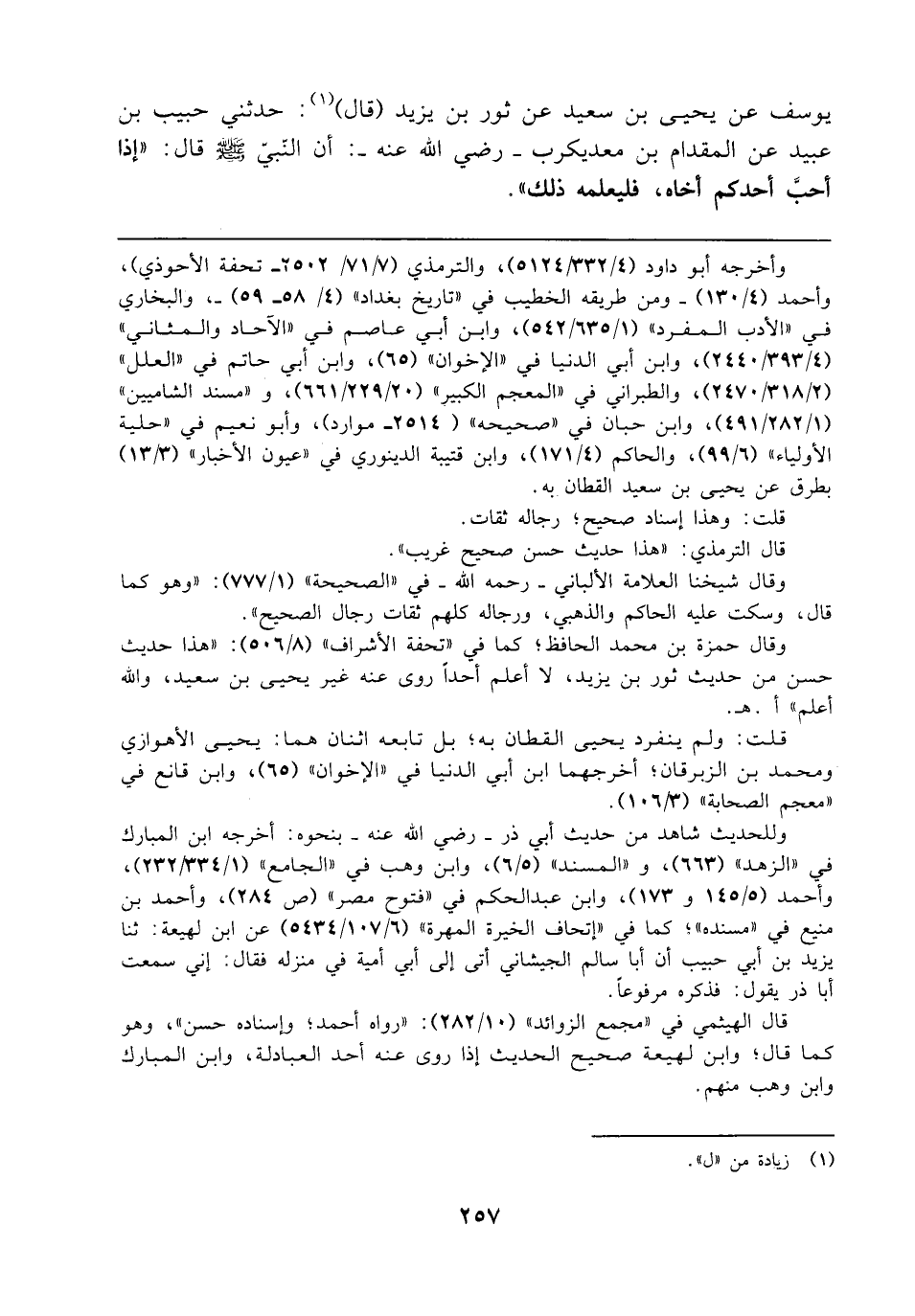 يوسف عن يحيى بن سعيد عن ثور بن يزيد (قال) (¬1): حدثني حبيب بن عبيد عن المقدام بن معديكرب - رضي الله عنه -: أن النّبيّ قال: "إذا أحبَّ أحدكم أخاه، فليعلمه ذلك".