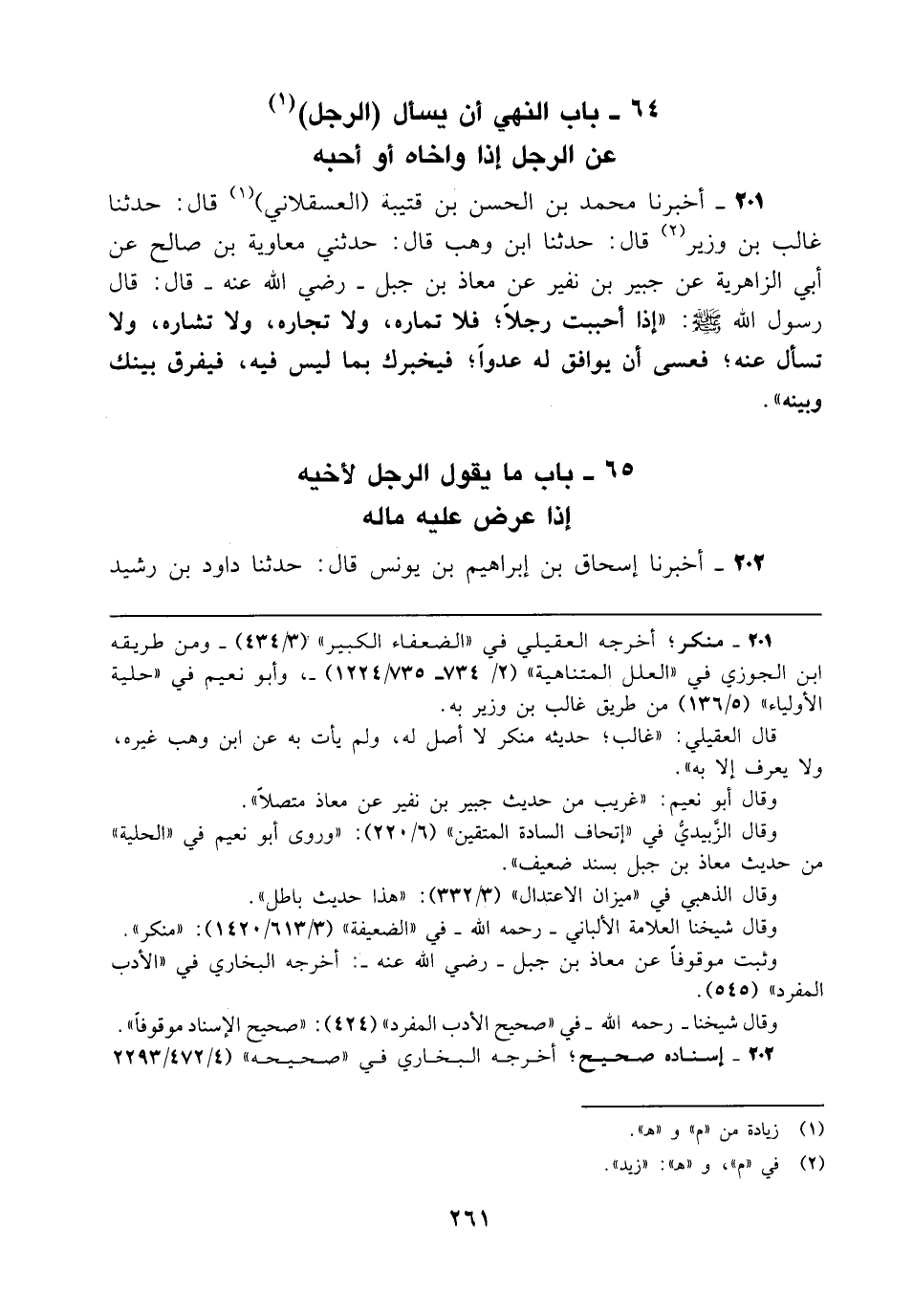 201 - أخبرنا محمد بن الحسن بن قتيبة (العسقلاني) (1) قال: حدثنا غالب بن وزير (¬2) قال: حدثنا ابن وهب قال: حدثني معاوية بن صالح عن أبي الزاهرية عن جبير بن نفير عن معاذ بن جبل - رضي الله عنه - قال: قال رسول الله - صلى الله عليه وسلم -: "إذا أحببت رجلًا؛ فلا تماره، ولا تجاره، ولا تشاره، ولا تسأل عنه؛ فعسى أن يوافق له عدوًا؛ فيخبرك بما ليس فيه، فيفرق بينك وبينه".