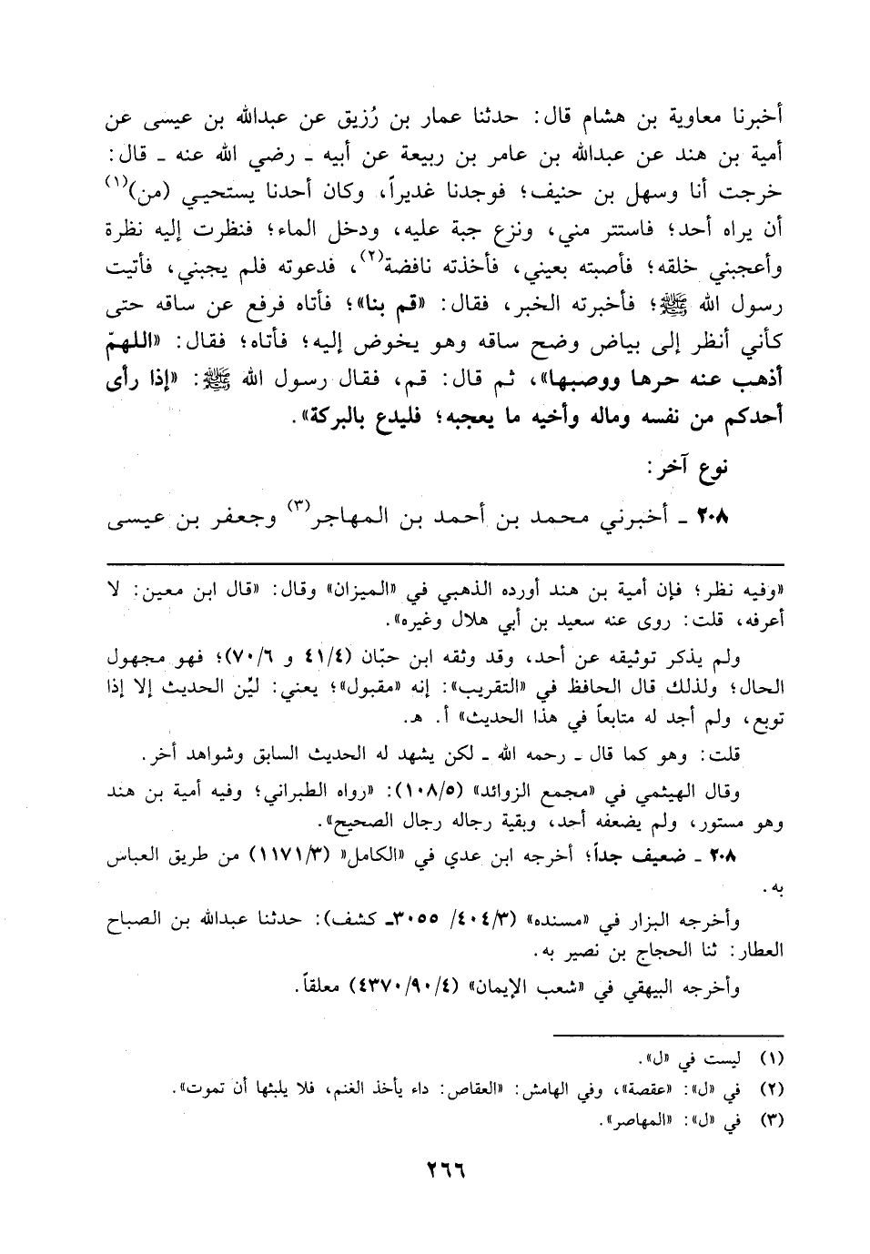أخبرنا معاوية بن هشام قال: حدثنا عمار بن رُزيق عن عبد الله بن عيسى عن أمية بن هند عن عبد الله بن عامر بن ربيعة عن أبيه - رضي الله عنه - قال: خرجت أنا وسهل بن حنيف؛ فوجدنا غديرًا، وكان أحدنا يستحيي (من) (¬1) أن يراه أحد؛ فاستتر مني، ونزع جبة عليه، ودخل الماء؛ فنظرت إليه نظرة وأعجبني خلقه؛ فأصبته بعيني، فأخذته نافضة (¬2)، فدعوته فلم يجبني، فأتيت رسول الله - صلى الله عليه وسلم -؛ فأخبرته الخبر، فقال: "قم بنا"؛ فأتاه فرفع عن ساقه حتى كأني انظر إلى بياض وضح ساقه وهو يخوض إليه؛ فأتاه؛ فقال: "اللهمّ أذهب عنه حرها ووصبها"، ثم قال: قم، فقال رسول الله - صلى الله عليه وسلم -: "إذا رأى أحدكم من نفسه وماله وأخيه ما يعجبه؛ فليدع بالبركة". نوع آخر: