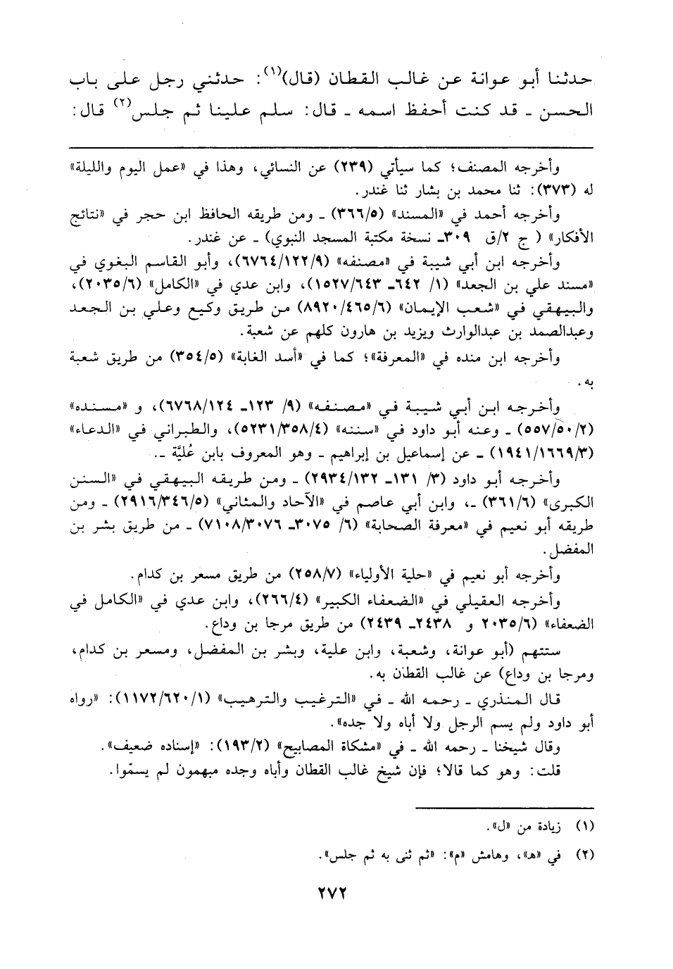 قلت: وهو كما قالا؛ فإن شيخ غالب القطان وأباه وجده مبهمون لم يسمّوا.