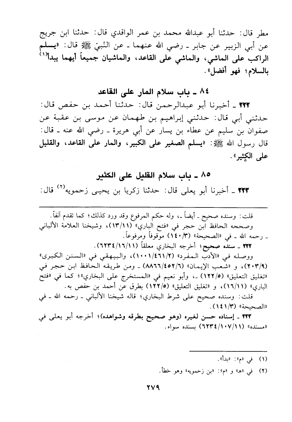 مطر قال: حدثنا أبو عبد الله محمد بن عمر الواقدي قال: حدثنا ابن جريج عن أبي الزبير عن جابر - رضي الله عنهما - عن النّبيّ - صلى الله عليه وسلم - قال: "يسلم الراكب على الماشي، والماشي على القاعد، والماشيان جميعًا أيهما يبدأ (¬1) بالسلام؛ فهو أفضل".