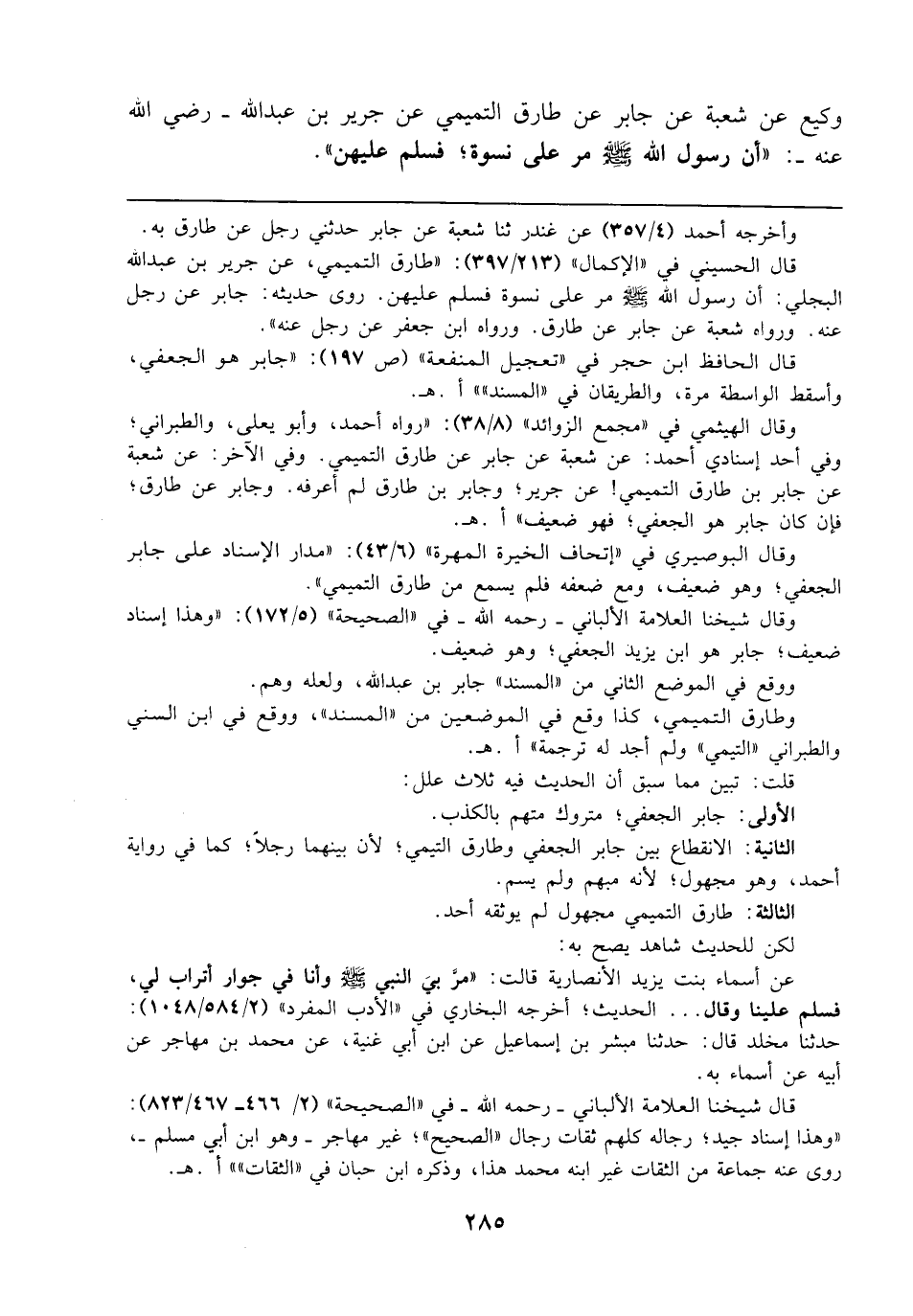 وكيع عن شعبة عن جابر عن طارق التميمي عن جرير بن عبد الله - رضي الله عنه -. "أن رسول الله - صلى الله عليه وسلم - مر على نسوة؛ فسلم عليهن".