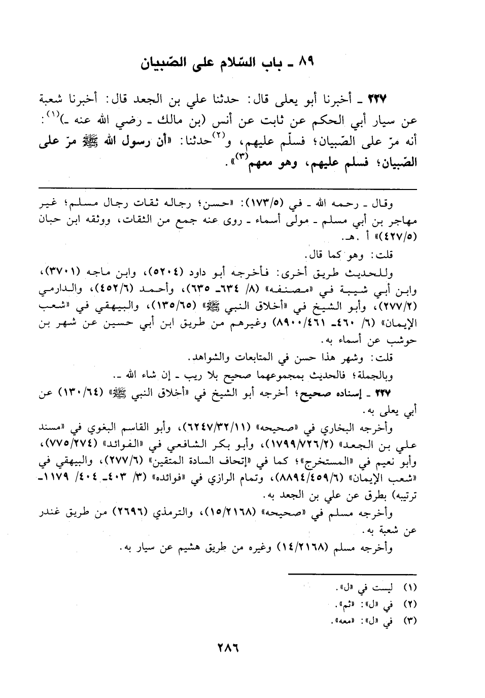 227 - أخبرنا أبو يعلى قال: حدثنا علي بن الجعد قال: أخبرنا شعبة عن سيار أبي الحكم عن ثابت عن أنس (بن مالك - رضي الله عنه -) (¬1): أنه مرّ على الصّبيان؛ فسلّم عليهم، و (¬2) حدثنا: "أن رسول الله - صلى الله عليه وسلم - مرّ على الصّبيان؛ فسلم عليهم، وهو معهم (¬3) ".