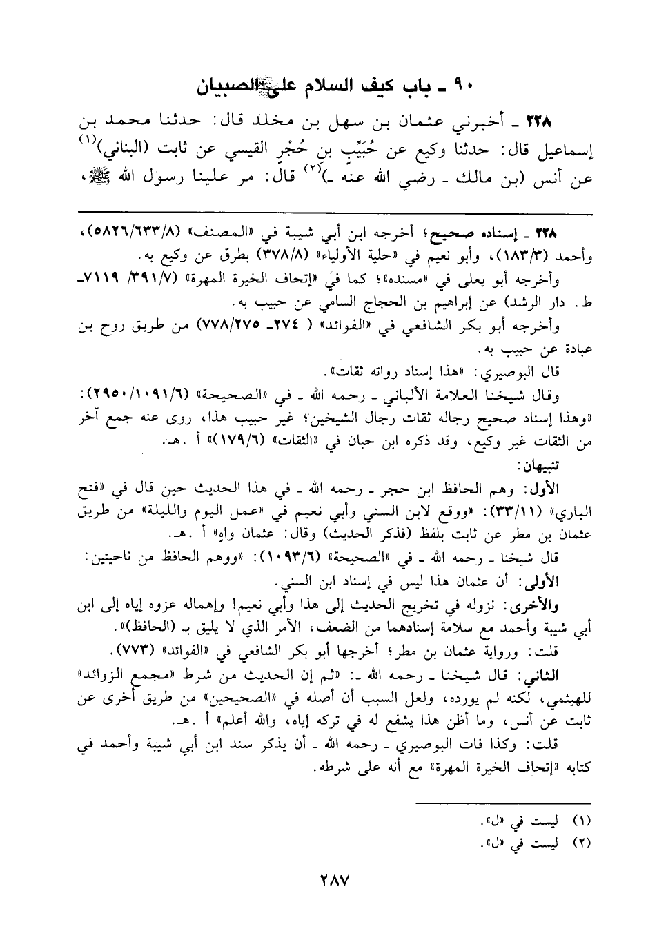 والأخرى: نزوله في تخريج الحديث إلى هذا وأبي نعيم! وإهماله عزوه إياه إلى ابن أبي شيبة وأحمد مع سلامة إسنادهما من الضعف، الأمر الذي لا يليق بـ (الحافظ) ".