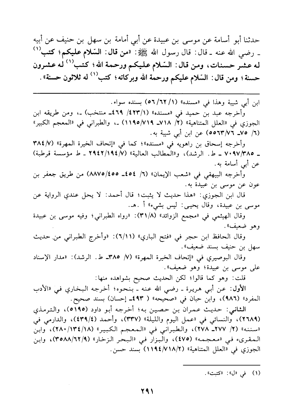 حدثنا أبو أسامة عن موسى بن عبيدة عن أبي أمامة بن سهل بن حنيف عن أبيه - رضي الله عنه - قال: قال رسول الله - صلى الله عليه وسلم -: "من قال: السّلام عليكم؛ كتب (¬1) له عشر حسنات، ومن قال: السّلام عليكم ورحمة الله؛ كتب (1) له عشرون حسنة؛ ومن قال: السّلام عليكم ورحمة الله وبركاته؛ كتب (1) له ثلاثون حسنة".