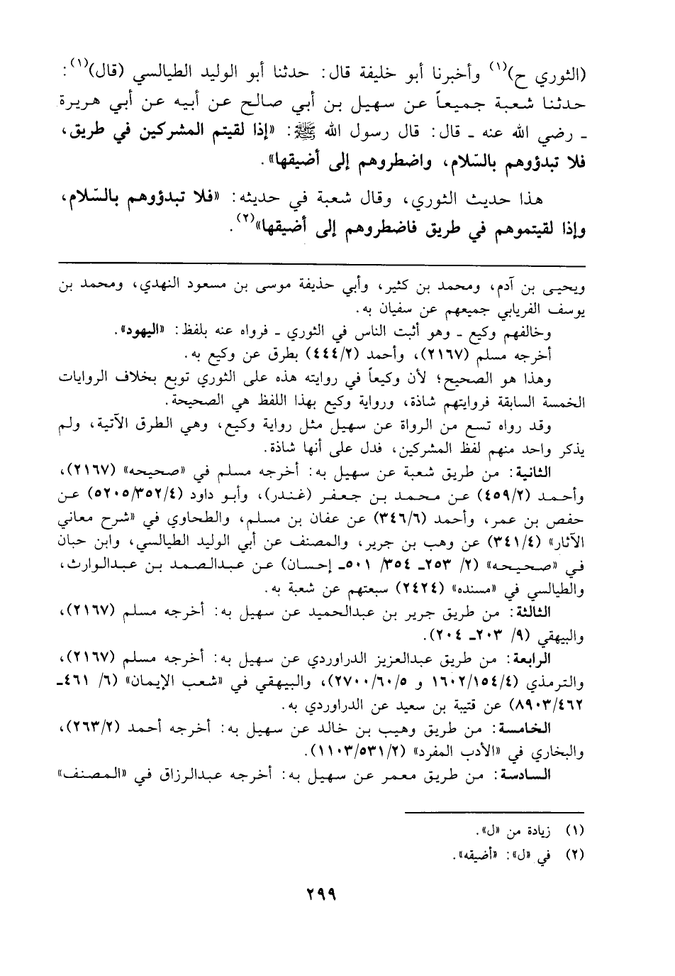 (الثوري ح) (¬1) وأخبرنا أبو خليفة قال: حدثنا أبو الوليد الطيالسي (قال) (1): حدثنا شعبة جميعًا عن سهيل بن أبي صالح عن أبيه عن أبي هريرة - رضي الله عنه - قال: قال رسول الله - صلى الله عليه وسلم -: "إذا لقيتم المشركين في طريق، فلا تبدؤوهم بالسّلام، واضطروهم إلى أضيقها".