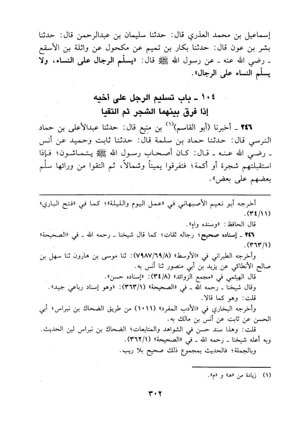 246 - أخبرنا (أبو القاسم) (¬1) بن منيع قال: حدثنا عبد الأعلي بن حماد النرسي قال: حدثنا حماد بن سلمة قال: حدثنا ثابت وحميد عن أنس - رضي الله عنه - قال: كان أصحاب رسول الله - صلى الله عليه وسلم - يتماشون؛ فإذا استقبلتهم شجرة أو أكمة؛ فتفرقوا يمينًا وشمالًا، ثم التقوا من ورائها سلَّم بعضهم على بعض".
