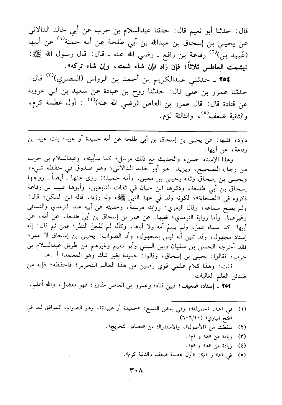 قال: حدثنا أبو نعيم قال: حدثنا عبد السلام بن حرب عن أبي خالد الدالاني عن يحيى بن إسحاق بن عبد الله بن أبي طلحة عن أمه حمنة (¬1) عن أبيها (عُبيد بن) (¬2) رفاعة بن رافع - رضي الله عنه - قال: قال رسول الله - صلى الله عليه وسلم -: "يشمت العاطس ثلاثًا؛ فإن زاد فإن شاء شمته، وإن شاء تركه".