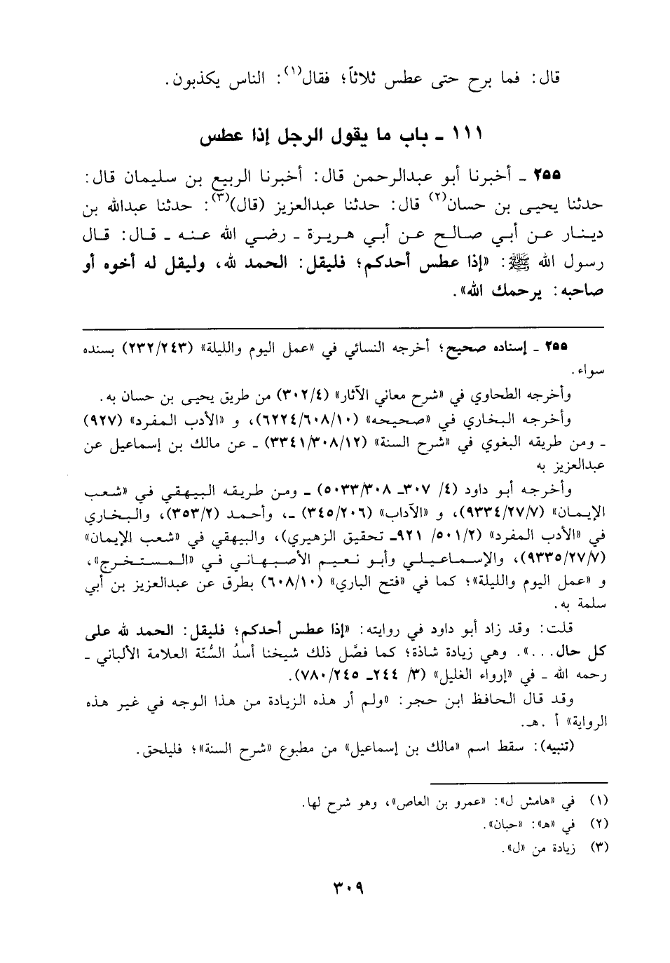 قلت: وقد زاد أبو داود في روايته: "إذا عطس أحدكم؛ فليقل: الحمد لله على كل حال ... ". وهي زيادة شاذة؛ كما فصَّل ذلك شيخنا أسدُ السُّنّة العلامة الألباني - رحمه الله - في "إرواء الغليل " (3/ 244 - 245/ 780).
