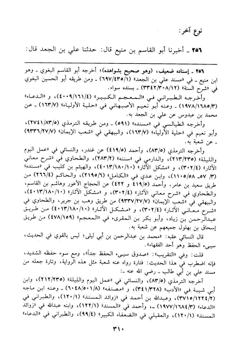 256 - أخبرنا أبو القاسم بن منيع قال: حدثنا علي بن الجعد قال: