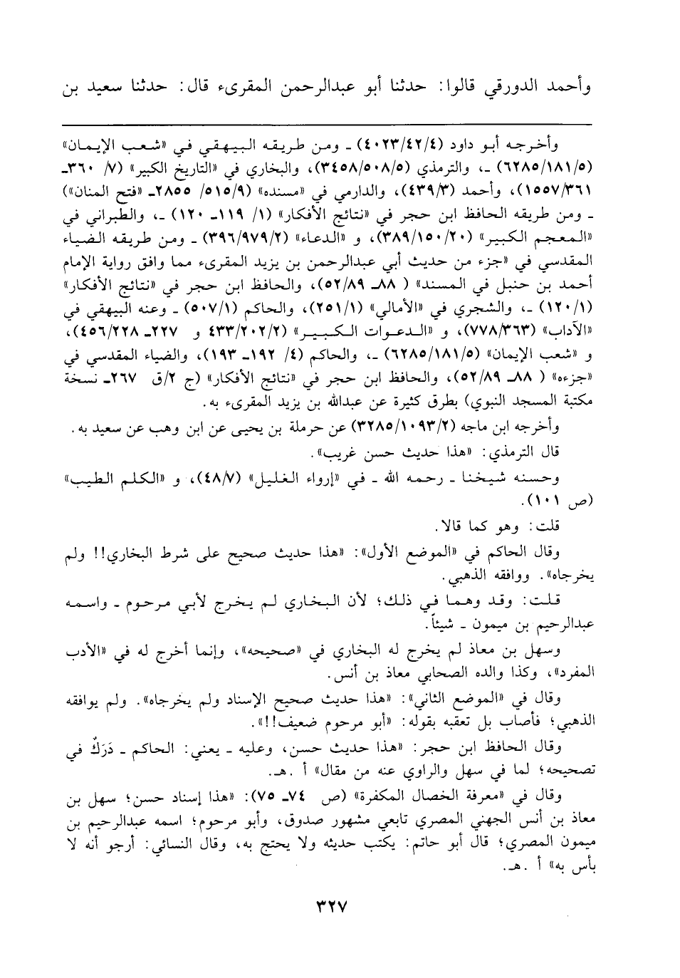 وأخرجه أبو داود (4/ 42/ 4023) -ومن طريقه البيهقي في "شعب الإيمان" (5/ 181/ 6285) -، والترمذي (5/ 508/ 3458)، والبخاري في "التاريخ الكبير" (7/ 360 - 361/ 1557)، وأحمد (3/ 439)، والدارمي في "مسنده" (9/ 515/ 2855 - "فتح المنان") -ومن طريقه الحافظ ابن حجر في "نتائج الأفكار" (1/ 119 - 120) -، والطبراني في "المعجم الكبير" (20/ 150/ 389)، و"الدعاء" (2/ 979/ 369) -ومن طريقه الضياء المقدسي في "جزء من حديث أبي عبد الرحمن بن يزيد المقرئ مما وافق رواية الإِمام أحمد بن حنبل في المسند" (88 - 89/ 52)، والحافظ ابن حجر في "نتائج الأفكار" (1/ 120) -، والشجري في "الأمالي" (1/ 251)، والحاكم (1/ 507) -وعنه البيهقي في "الآداب" (363/ 778)، و"الدعوات الكبير" (2/ 202/ 433 و 227 - 228/ 456)، و"شعب الإيمان" (15/ 181/ 6285) -، والحاكم (4/ 192 - 193)، والضياء المقدسي في "جزءه" (88 - 89/ 52)، والحافظ ابن حجر في "نتائج الأفكار" (ج 2/ق 267 - نسخة مكتبة المسجد النبوي) بطرق كثيرة عن عبد الله بن يزيد المقرئ به.