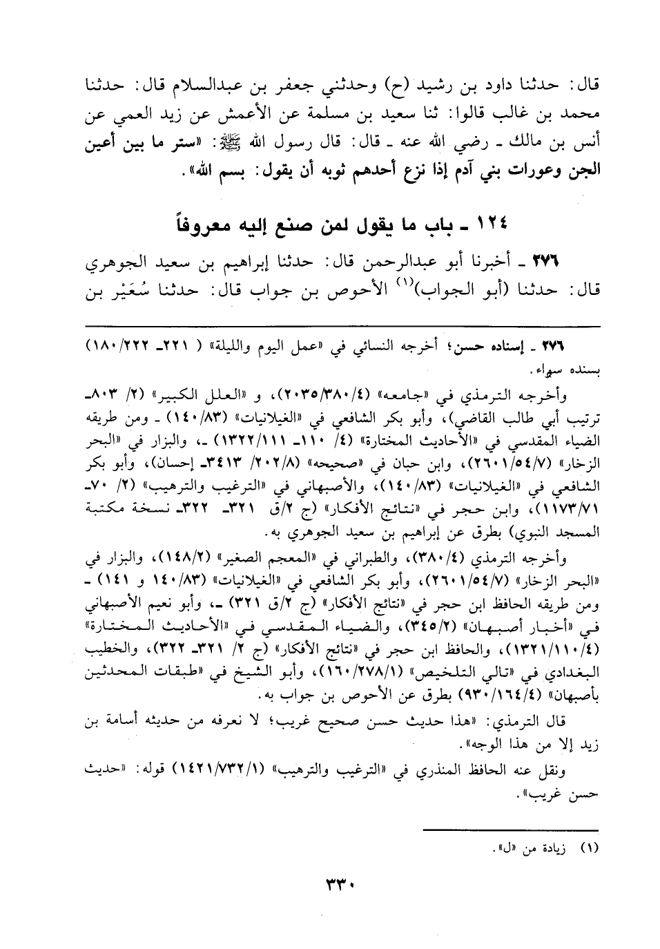 وأخرجه الترمذي (4/ 380)، والطبراني في "المعجم الصغير" (2/ 148)، والبزار في "البحر الزخار" (7/ 54 /2061)، وأبو بكر الشافعي في "الغيلانيات" (83/ 140 و 141) -ومن طريقه الحافظ ابن حجر في "نتائج الأفكار" (ج 2 /م ق 321) -، وأبو نعيم الأصبهاني في "أخبار أصبهان" (2/ 345)، والضياء المقدسي في "الأحاديث المختارة" (4/ 110/ 1321)، والحافظ ابن حجر في "نتائج الأفكار" (ج 2/ 321 - 322)، والخطيب البغدادي في "تالي التلخيص" (1/ 278/ 160)، وأبو الشيخ في "طبقات المحدثين بأصبهان" (4/ 164/ 930) بطرق عن الأحوص بن جواب به.