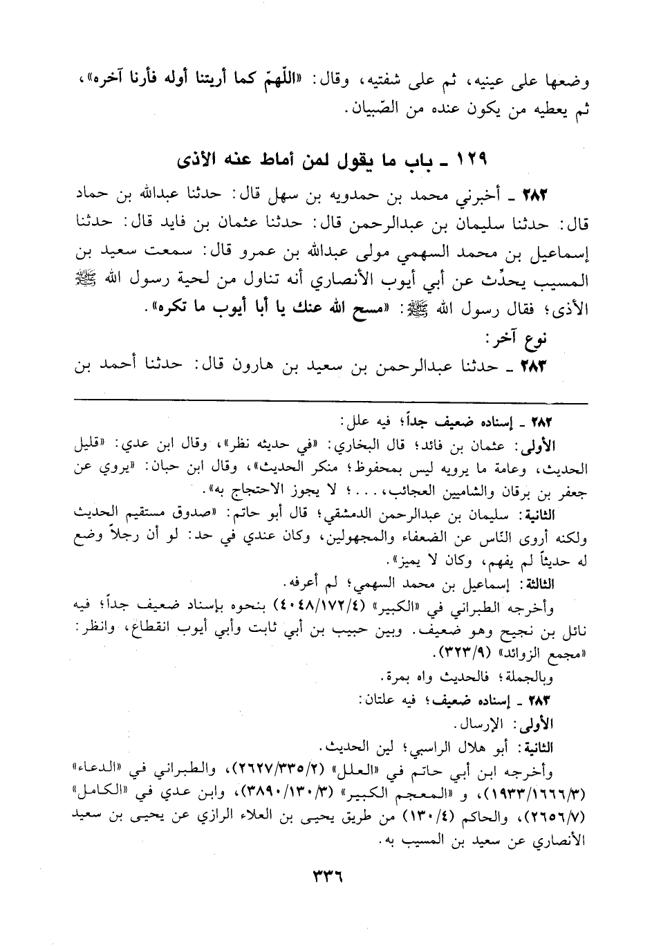 282 - أخبرني محمَّد بن حمدويه بن سهل قال: حدثنا عبد الله بن حماد قال: حدثنا سليمان بن عبد الرحمن قال: حدثنا عثمان بن فايد قال: حدثنا إسماعيل بن محمَّد السهمي مولى عبد الله بن عمرو قال: سمعت سعيد بن المسيب يحدّث عن أبي أيوب الأنصاري أنه تناول من لحية رسول الله - صلى الله عليه وسلم - الأذى؛ فقال رسول الله - صلى الله عليه وسلم -: "مسح الله عنك يا أبا أيوب ما تكره".