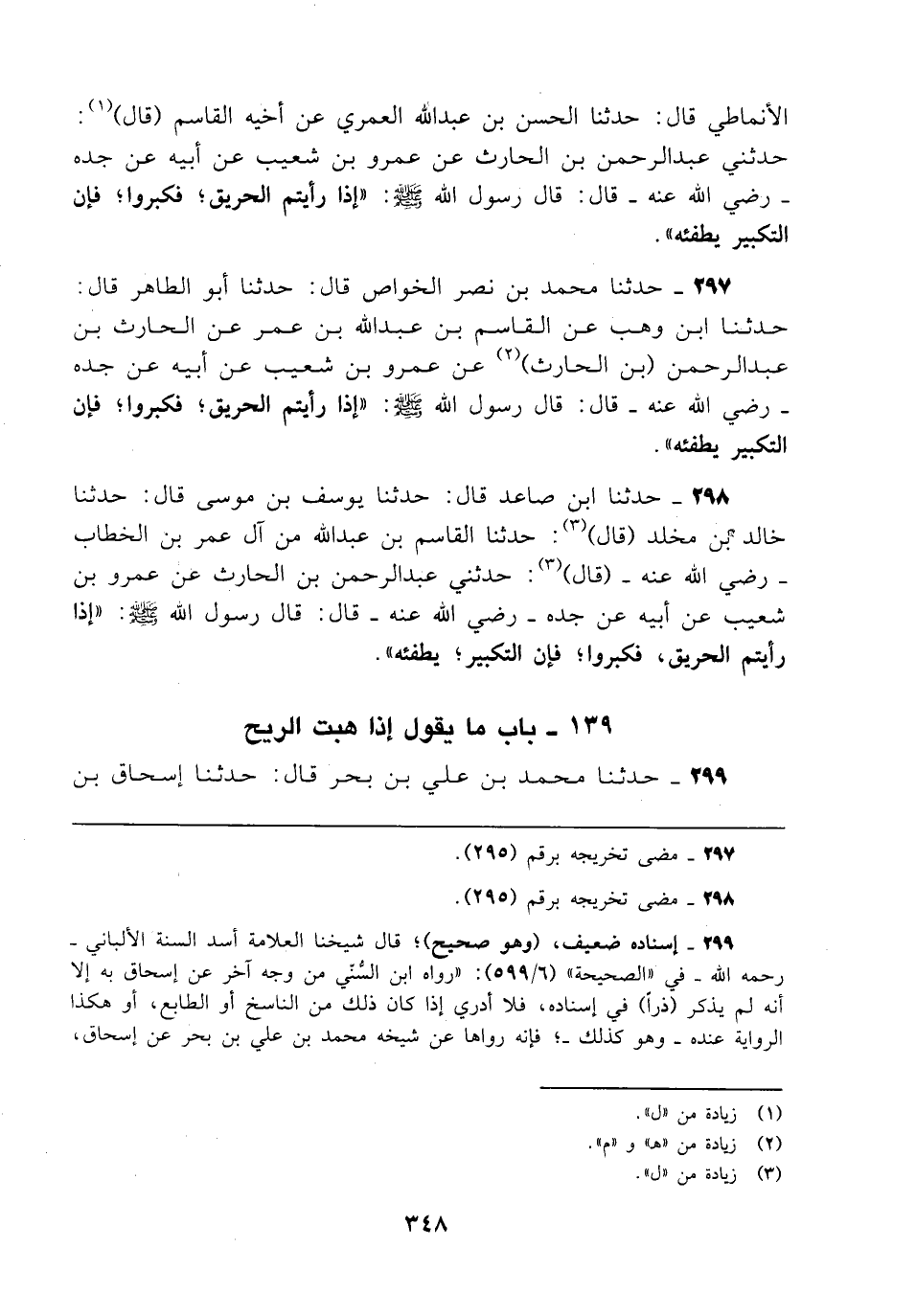 297 - حدثنا محمَّد بن نصر الخواص قال: حدثنا أبو الطاهر قال: حدثنا ابن وهب عن القاسم بن عبد الله بن عمر عن الحارث بن عبد الرحمن (بن الحارث) (¬2) عن عمرو بن شعيب عن أبيه عن جده - رضي الله عنه - قال: قال رسول الله - صلى الله عليه وسلم -:"إذا رأيتم الحريق؛ فكبروا؛ فإن التكبير يطفئه".