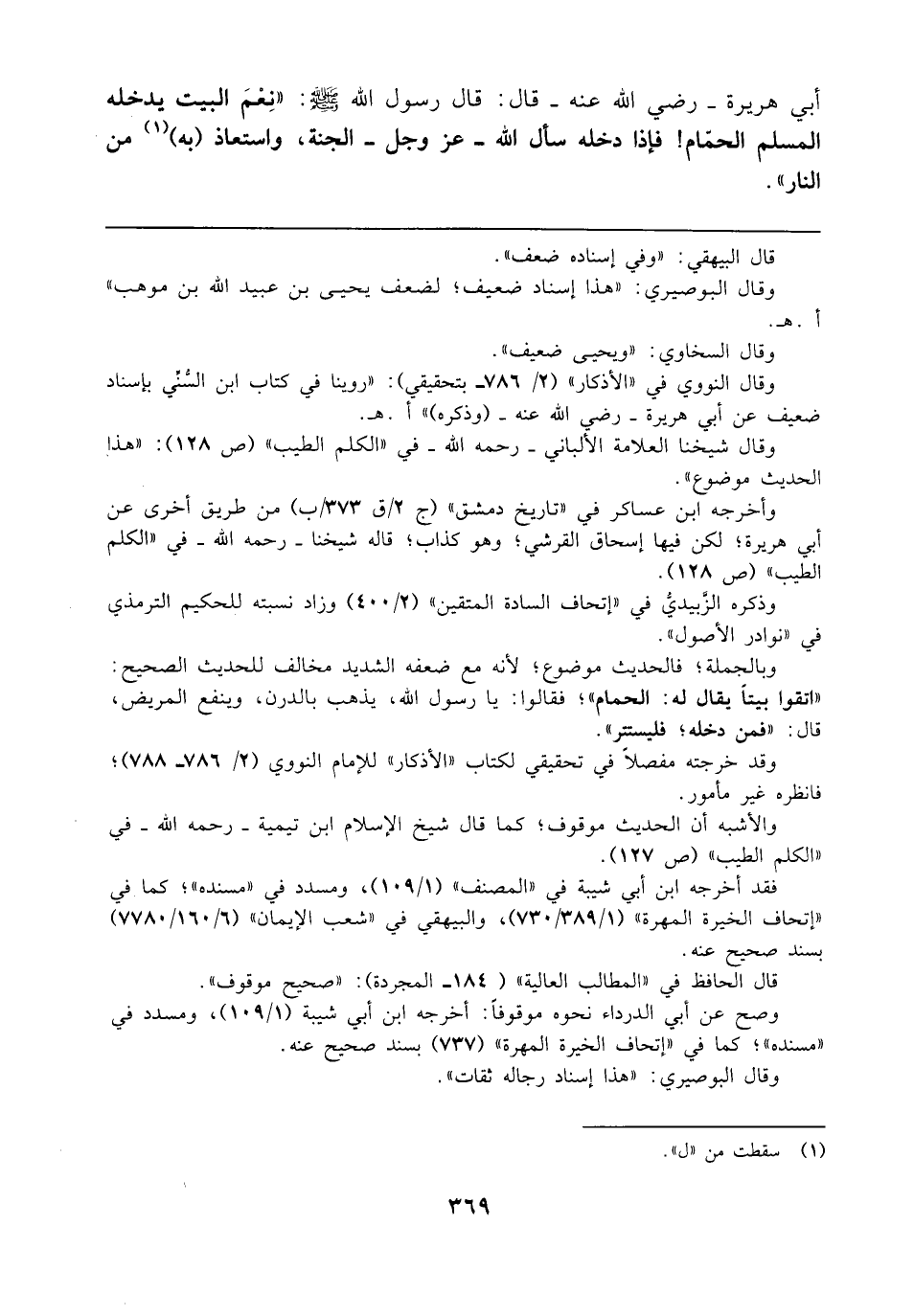 أبي هريرة - رضي الله عنه- قال: قال رسول الله - صلى الله عليه وسلم -: "نِعْمَ البيت يدخله المسلم الحمّام! فإذا دخله سأل الله - عَزَّ وَجَلَّ - الجنة، واستعاذ (به) (¬1) من النار".