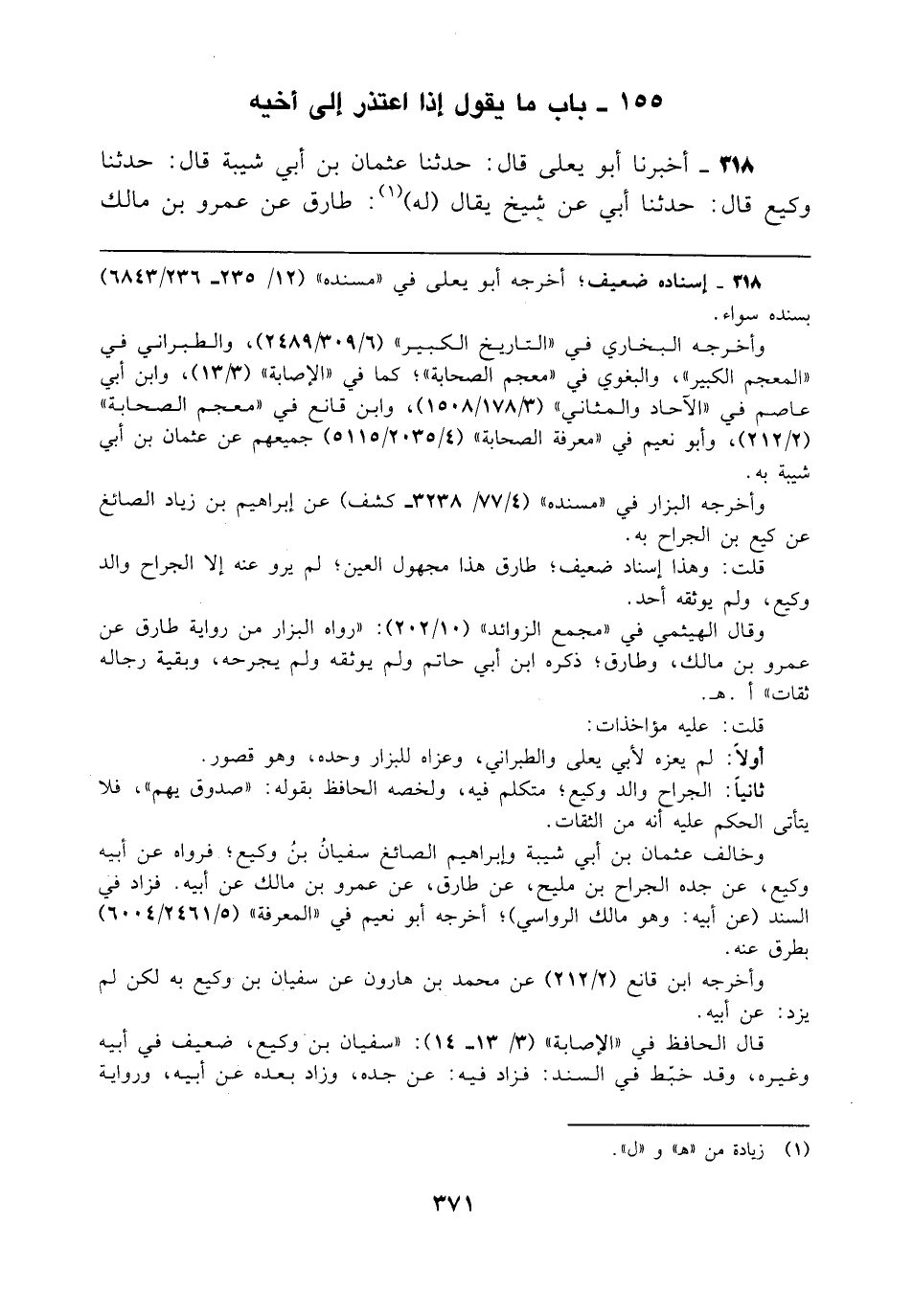 318 - أخبرنا أبو يعلى قال: حدثنا عثمان بن أبي شيبة قال: حدثنا وكيع قال: حدثنا أبي عن شيخ يقال (له) (¬1): طارق عن عمرو بن مالك
