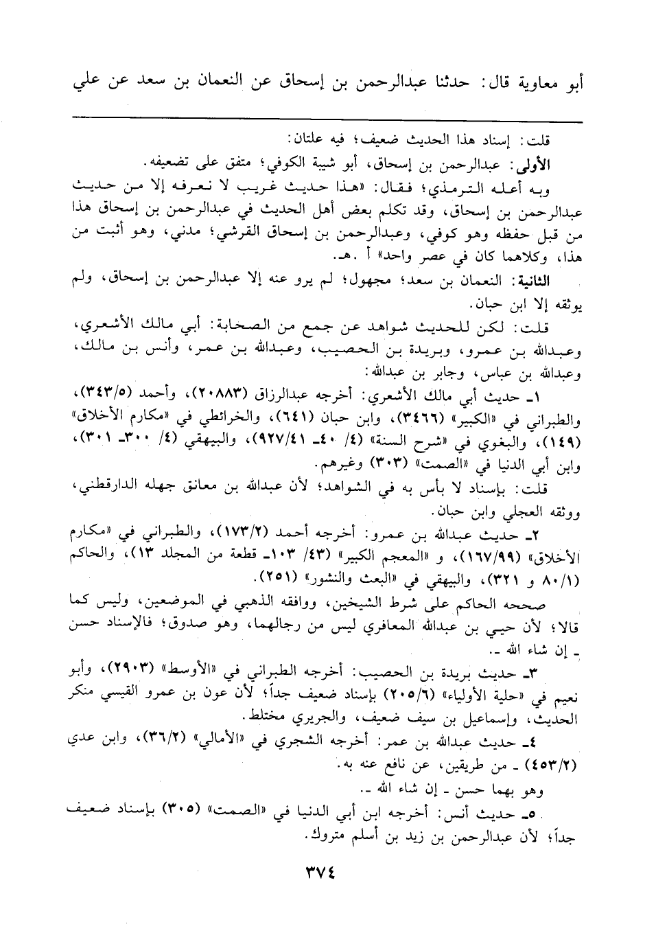 1 - حديث أبي مالك الأشعري: أخرجه عبد الرزاق (20883)، وأحمد (5/ 343)، والطبراني في "الكبير" (3466)، وابن حبان (641)، والخرائطي في "مكارم الأخلاق" (149)، والبغوي في "شرح السنة" (4/ 40 - 41/ 927)، والبيهقي (4/ 300 - 301)، وابن أبي الدنيا في "الصمت" (303) وغيرهم.