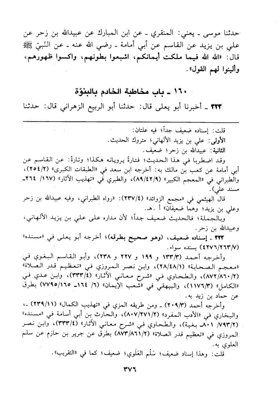 حدثنا موسى -يعني: المنقري- عن ابن المبارك عن عبيد الله بن زحر عن علي بن يزيد عن القاسم عن أبي أمامة - رضي الله عنه - عن النّبيّ - صلى الله عليه وسلم - قال: "الله الله فيما ملكت أيمانكم، اشبعوا بطونهم، واكسوا ظهورهم، وألينوا لهم القول".