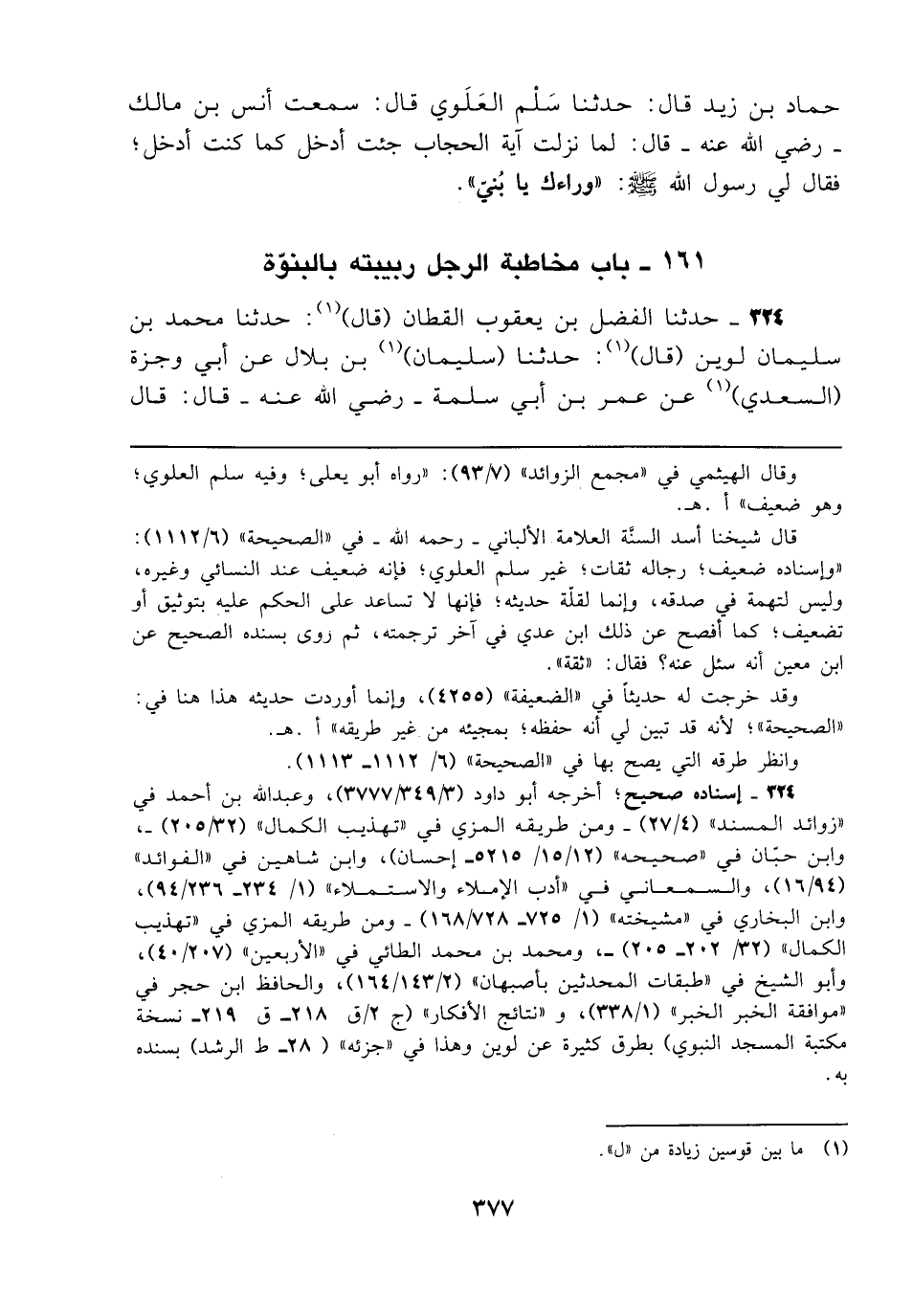حماد بن زيد قال: حدثنا سَلْم العَلَوي قال: سمعت أنس بن مالك - رضي الله عنه - قال: لما نزلت آية الحجاب جئت أدخل كما كنت أدخل؛ فقال لي رسول الله - صلى الله عليه وسلم -: "وراءك يا بُنيّ".