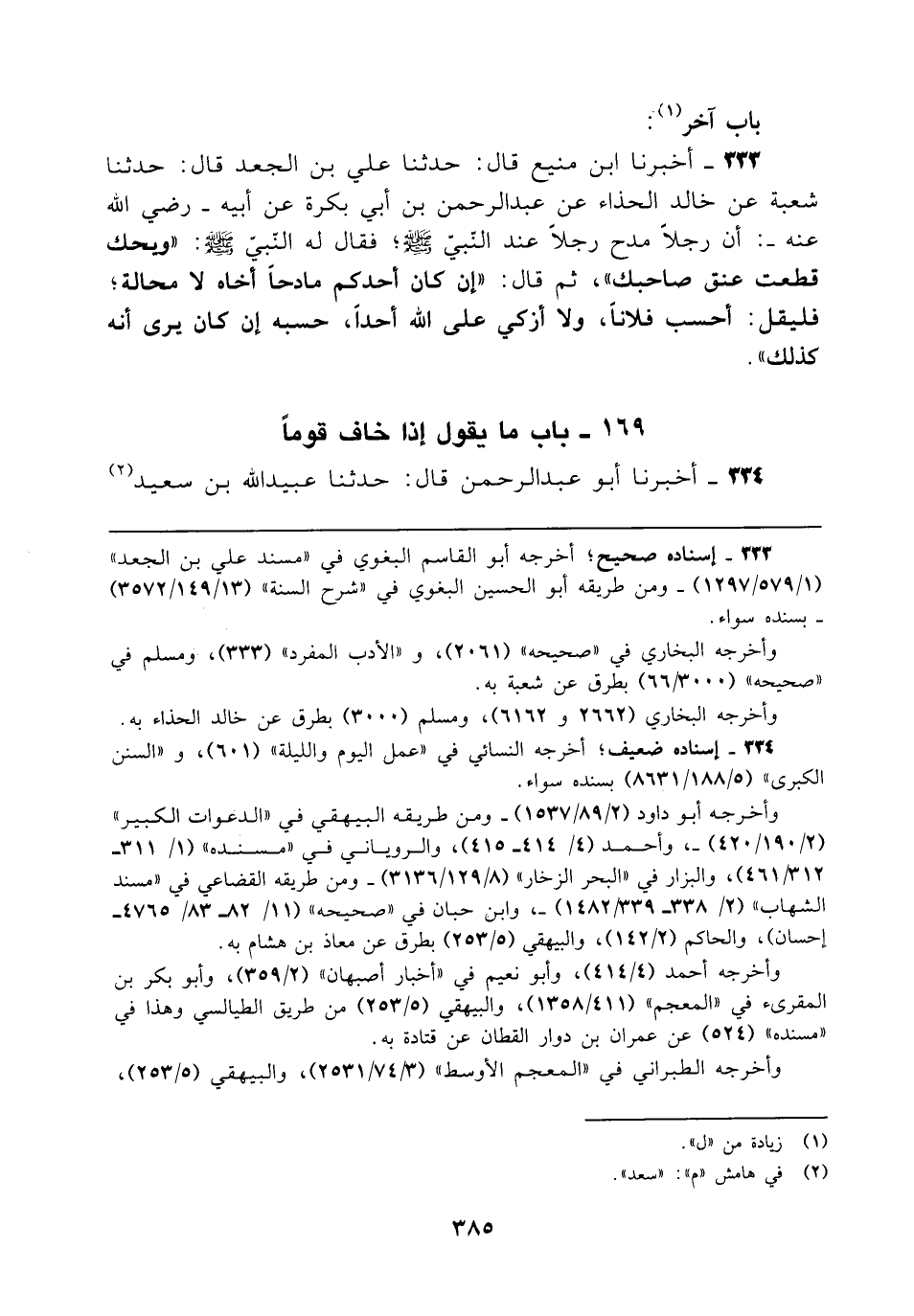 333 - أخبرنا ابن منيع قال: حدثنا علي بن الجعد قال: حدثنا شعبة عن خالد الحذاء عن عبد الرحمن بن أبي بكرة عن أبيه - رضي الله عنه -: أن رجلًا مدح رجلًا عند النّبيّ - صلى الله عليه وسلم -، فقال له النّبيّ - صلى الله عليه وسلم -: "ويحك قطعت عنق صاحبك"، ثم قال: "إن كان أحدكم مادحًا أخاه لا محالة؛ فليقل: أحسب فلانًا، ولا أزكي على الله أحدًا، حسبه إن كان يرى أنه كذلك".