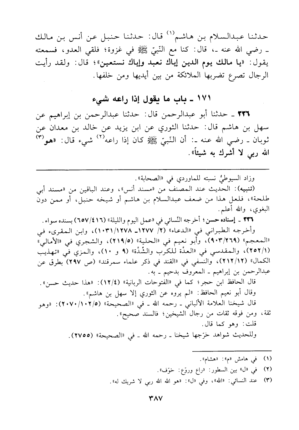 336 - حدثنا أبو عبد الرحمن قال: حدثنا عبد الرحمن بن إبراهيم عن سهل بن هاشم قال: حدثنا الثوري عن ابن يزيد عن خالد بن معدان عن ثوبان - رضي الله عنه -: أن النّبيّ - صلى الله عليه وسلم - كان إذا راعه (¬2) شيء قال: "هو (¬3) الله ربي لا أشرك به شيئًا".
