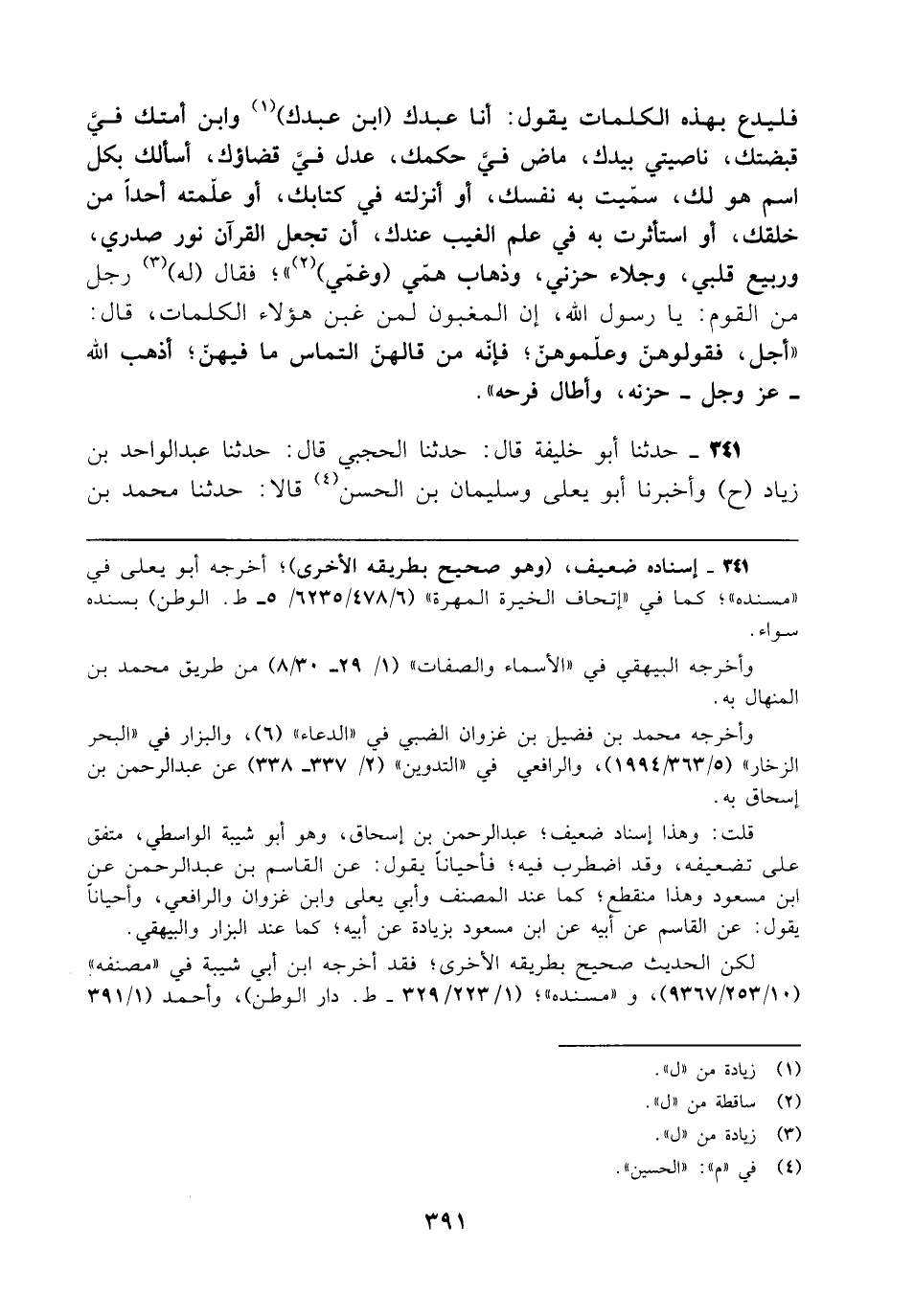فليدع بهذه الكلمات يقول: أنا عبدك (ابن عبدك) (¬1) وابن أمتك فيَّ قبضتك، ناصيتي بيدك، ماض فيَّ حكمك، عدل فيَّ قضاؤك، أسألك بكل اسم هو لك، سمّيت به نفسك، أو أنزلته في كتابك، أو علّمته أحدًا من خلقك، أو استأثرت به في علم الغيب عندك، أن تجعل القرآن نور صدري، وربيع قلبي، وجلاء حزني، وذهاب همّي (وغمّي) (¬2) "؛ فقال (له) (¬3) رجل من القوم: يا رسول الله، إن المغبون لمن غبن هؤلاء الكلمات، قال: "أجل، فقولوهنّ وعلّموهنّ؛ فإنّه من قالهنّ التماس ما فيهنّ؛ أذهب الله - عَزَّ وَجَلَّ - حزنه، وأطال فرحه".