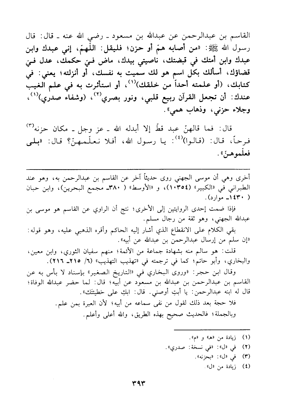 القاسم بن عبد الرحمن عن عبد الله بن مسعود - رضي الله عنه - قال: قال رسول الله - صلى الله عليه وسلم -: "من أصابه همّ أو حزن؛ فليقل: اللهمّ، إني عبدك وابن عبدك وابن أمتك في قبضتك، ناصيتي بيدك، ماض فيّ حكمك، عدل فيّ قضاؤك، أسألك بكل اسم هو لك سميت به نفسك، أو أنزلته؛ يعني: في كتابك، (أو علمته أحدًا من خلقك) (¬1)، أو استأثرت به في علم الغيب عندك: أن تجعل القرآن ربيع قلبي، ونور بصري (¬2)، (وشفاء صدري) (1)، وجلاء حزني، وذهاب همي".