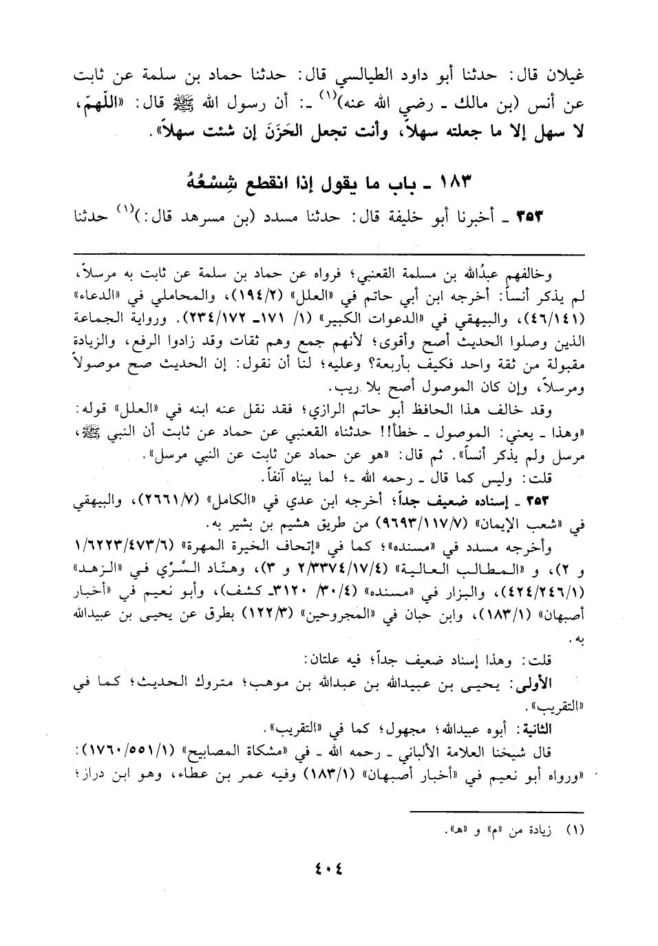 غيلان قال؛ حدثنا أبو داود الطيالسي قال؛ حدثنا حماد بن سلمة عن ثابت عن أنس (بن مالك - رضي الله عنه) (¬1) -: أن رسول الله - صلى الله عليه وسلم - قال: "اللهمّ، لا سهل إلا ما جعلته سهلًا، وأنت تجعل الحَزَنَ إن شئت سهلًا".