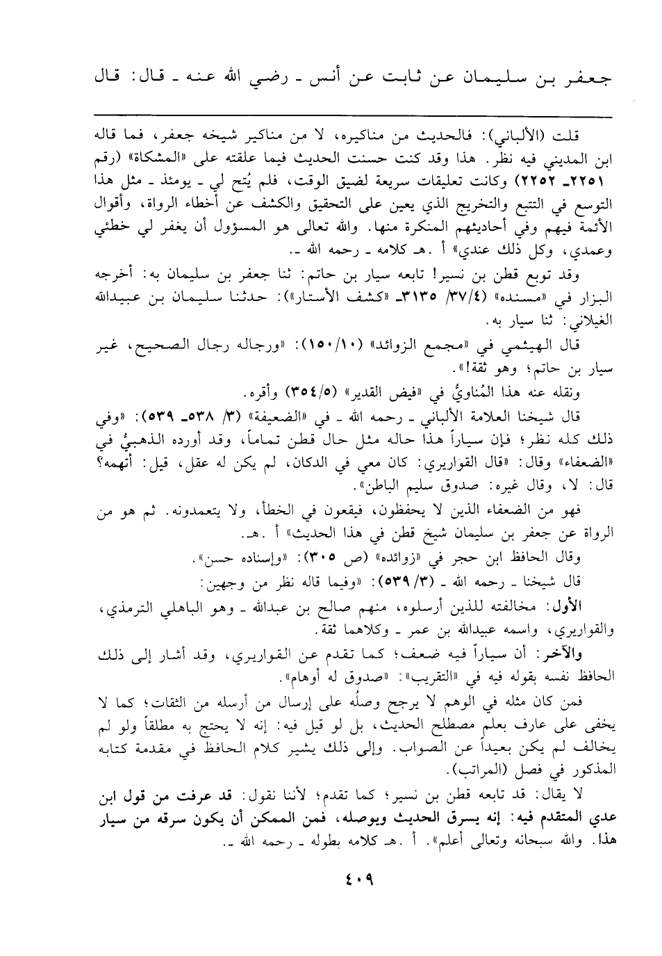لا يقال: قد تابعه قطن بن نسير؛ كما تقدم؛ لأننا نقول: قد عرفت من قول ابن عدي المتقدم فيه: إنه يسرق الحديث ويوصله، فمن الممكن أن يكون سرقه من سيار هذا. والله سبحانه وتعالى أعلم". أ. هـ كلامه بطوله - رحمه الله -.