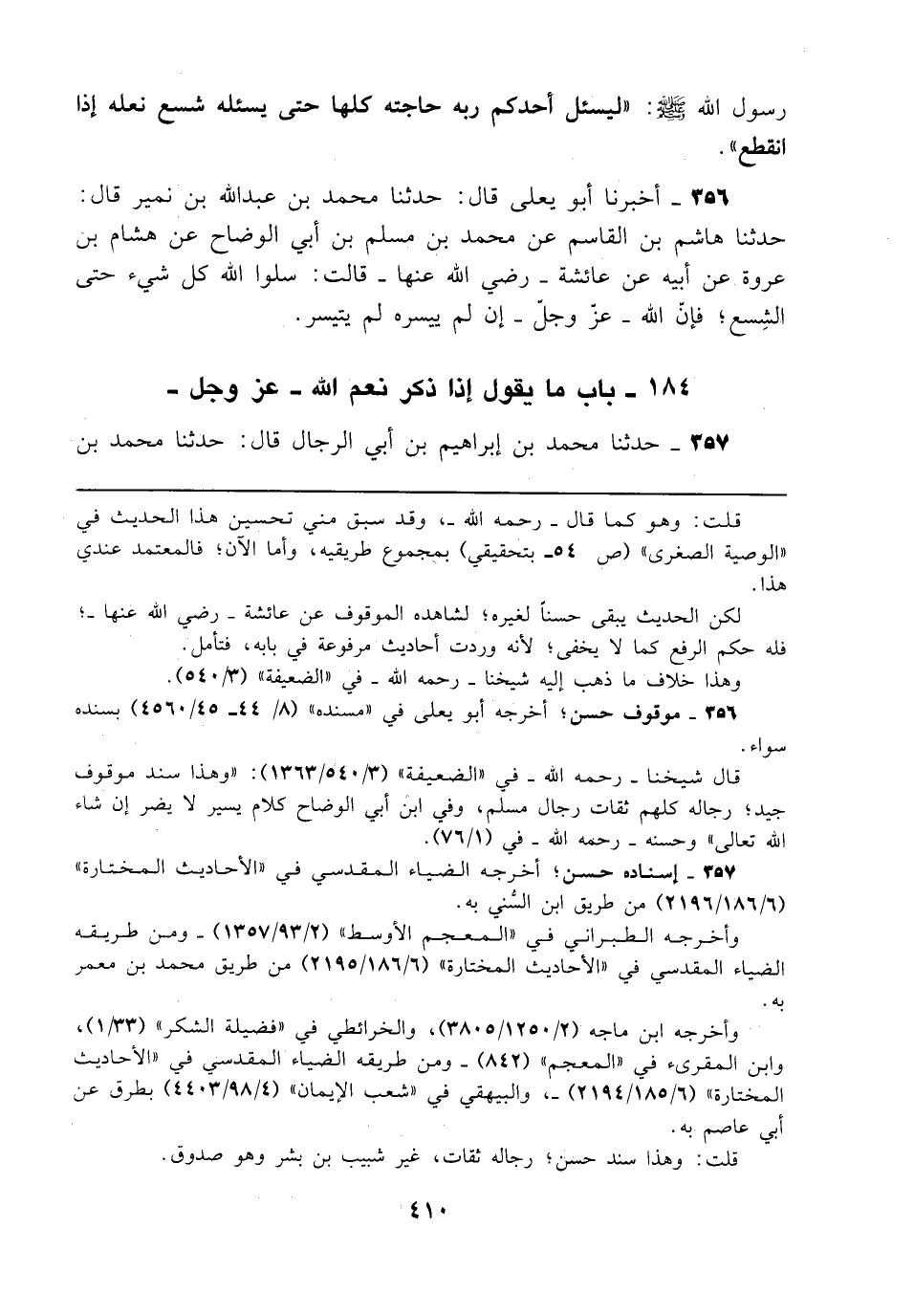 356 - أخبرنا أبو يعلى قال: حدثنا محمَّد بن عبد الله بن نمير قال: حدثنا هاشم بن القاسم عن محمَّد بن مسلم بن أبي الوضاح عن هشام بن عروة عن أبيه عن عائشة - رضي الله عنها - قالت: سلوا الله كل شيء حتى الشِسع؛ فإن الله -عزّ وجل- إن لم ييسره لم يتيسر.
