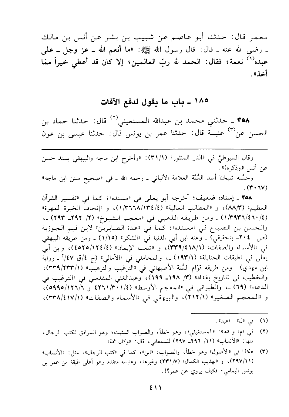 358 - حدثني محمَّد بن عبد الله المستعيني (¬2) قال: حدثنا حماد بن الحسن عن (¬3) عنبسة قال: حدثنا عمر بن يونس قال: حدثنا عيسى بن عون