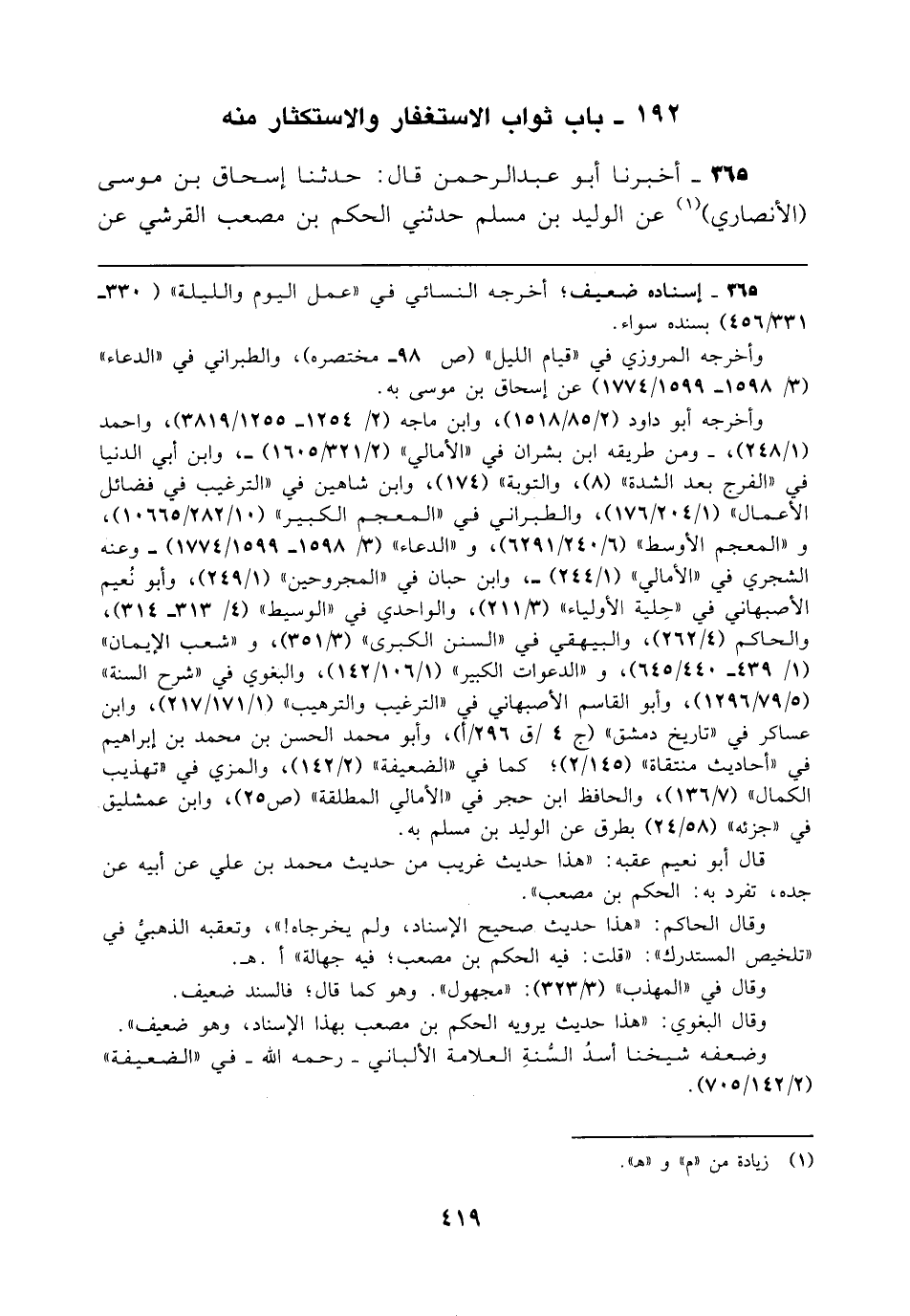 وأخرجه أبو داود (2/ 85/ 1518)، وابن ماجه (2/ 1254 - 1255/ 3819)، وأحمد (1/ 248)،-ومن طريقه ابن بشران في "الأمالي" (2/ 321/ 1605) -, وابن أبي الدنيا في "الفرج بعد الشدة" (8)، والتوبة" (174)، وابن شاهين في "الترغيب في فضائل الأعمال" (1/ 204/ 176)، والطبراني في "المعجم الكبير" (10/ 282/ 10665)، و"المعجم "الأوسط" (6/ 240/ 6291)، و"الدعاء" (3/ 1598 - 1599/ 1774) -وعنه الشجري في "الأمالي" (1/ 244) -، وابن حبان في "المجروحين" (1/ 249)، وأبو نُعيم الأصبهاني في "حِلية الأولياء" (3/ 211)، والواحدي في "الوسيط" (4/ 313 - 314)، والحاكم (4/ 262)، والبيهقي في "السنن الكبرى" (3/ 351)، و"شعب الإيمان" (1/ 439 - 440/ 645)، و"الدعوات الكبير" (1/ 106/ 142)، والبغوي في "شرح السنة" (5/ 79 / 1296)، وأبو القاسم الأصبهاني في "الترغيب والترهيب" (1/ 171/ 217)، وابن عساكر في "تاريخ دمشق" (ج 4/ق 296/ أ)، وأبو محمَّد الحسن بن محمَّد بن إبراهيم في "أحاديث منتقاة" (145/ 2)، كما في "الضعيفة" (2/ 142)، والمزي في "تهذيب الكمال" (7/ 136)، والحافظ ابن حجر في "الأمالي المطلقة" (ص 25)، وابن عمشليق في "جزئه" (58/ 24) بطرق عن الوليد بن مسلم به.