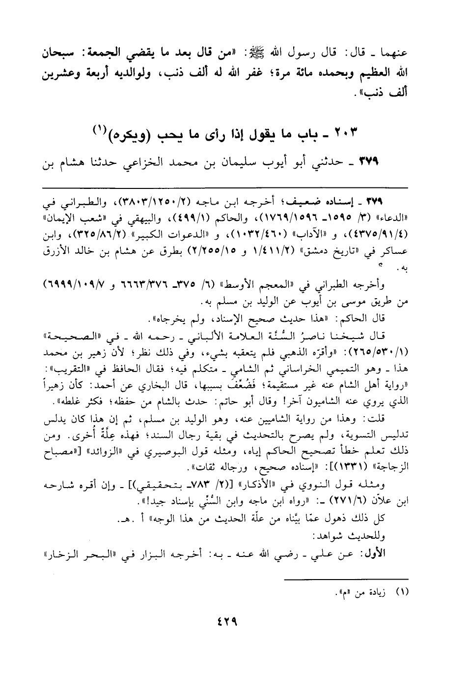 قلت: وهذا من رواية الشاميين عنه، وهو الوليد بن مسلم، ثم إن هذا كان يدلس تدليس التسوية، ولم يصرح بالتحديث في بقية رجال السند، فهذه عِلَّة أُخرى. ومن ذلك تعلم خطأ تصحيح الحاكم إياه، ومثله قول البوصيري في "الزوائد" ["مصباح الزجاجة" (1331)]: "إسناده صحيح، ورجاله ثقات".